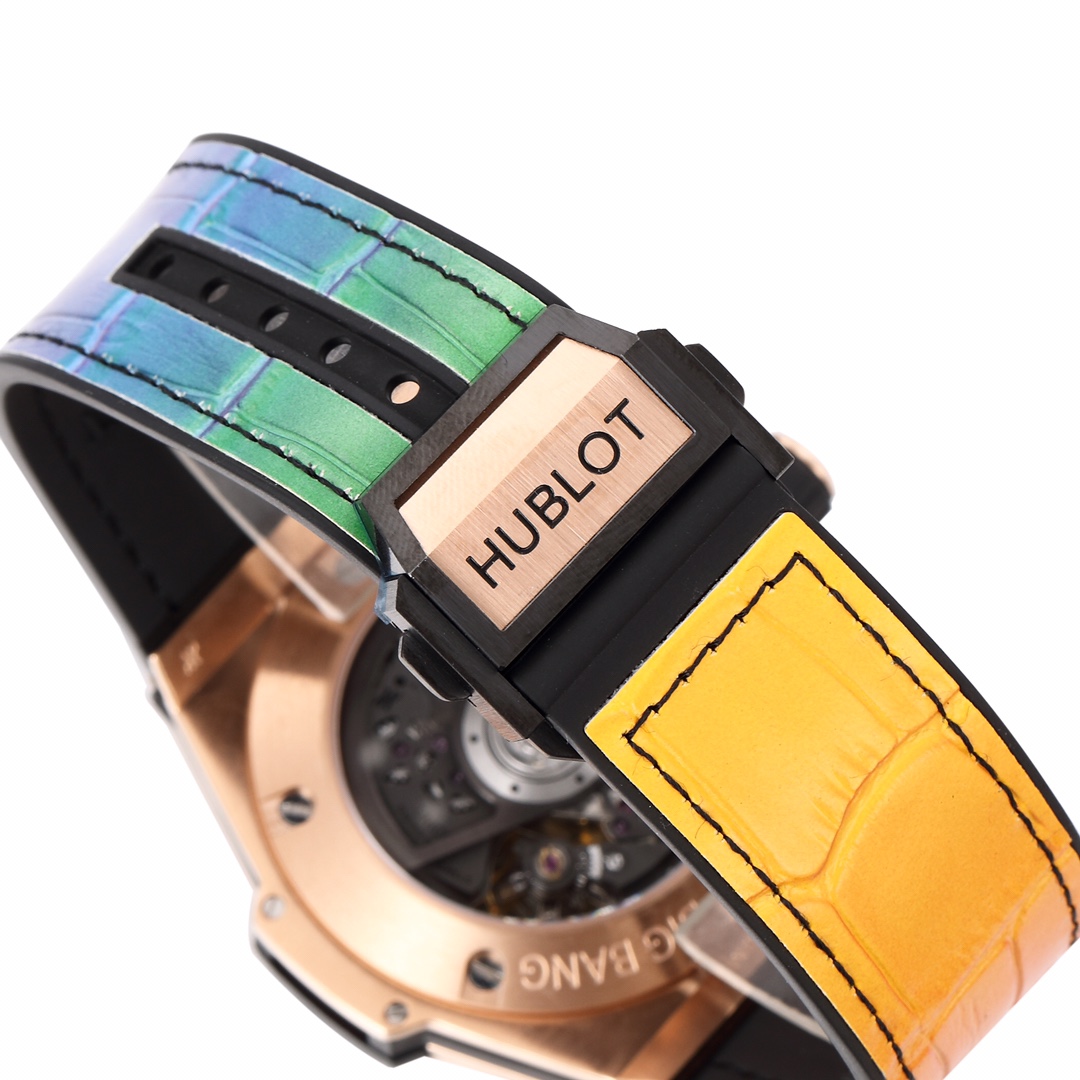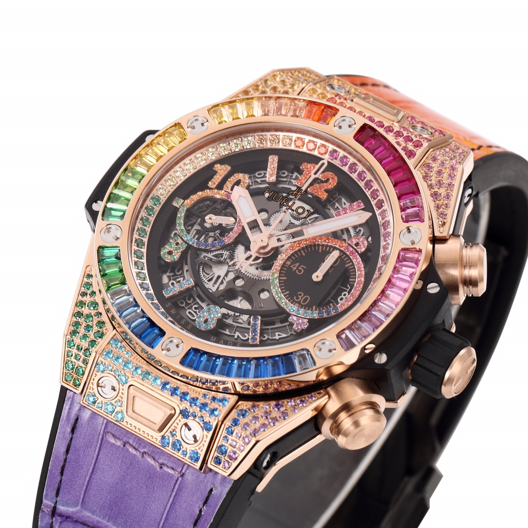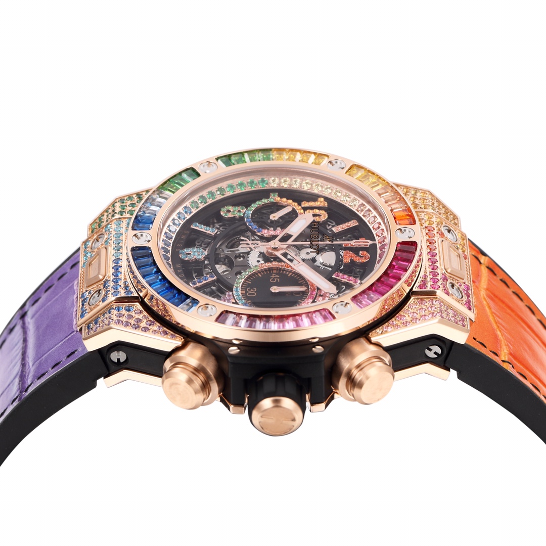 | Hublot Big Bang Unico Rainbow 42mm Dial Yellow Gold Square Diamond Bezel Purple Orange Leather Strap 441.OX.9910.LR.0999 | |