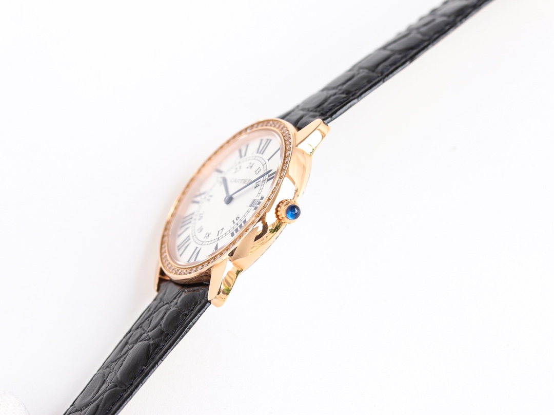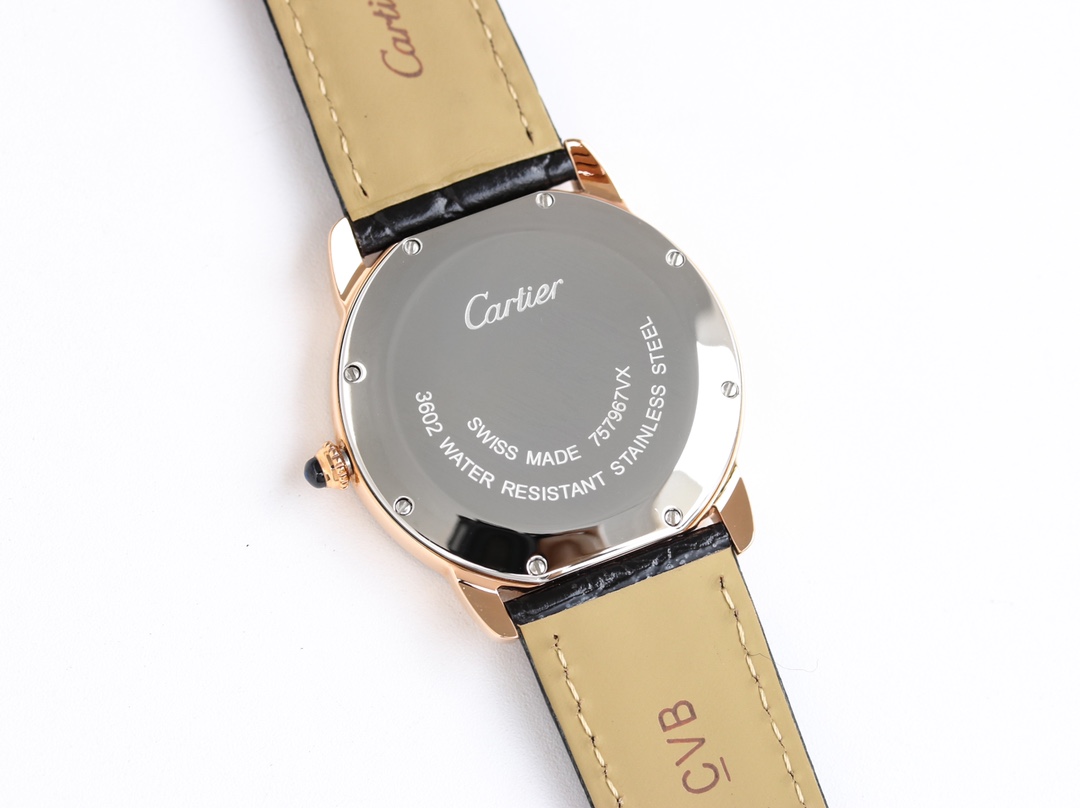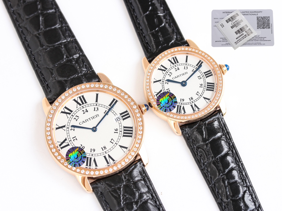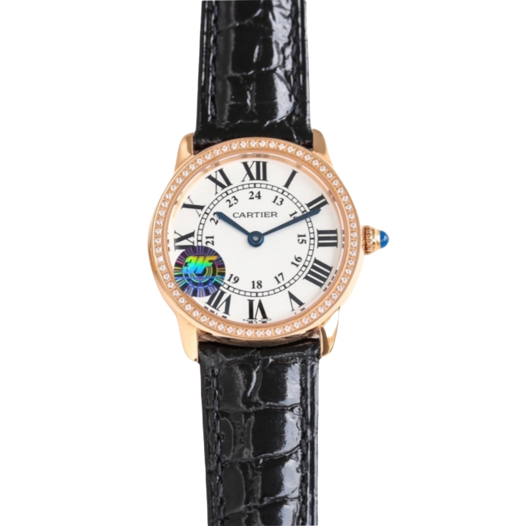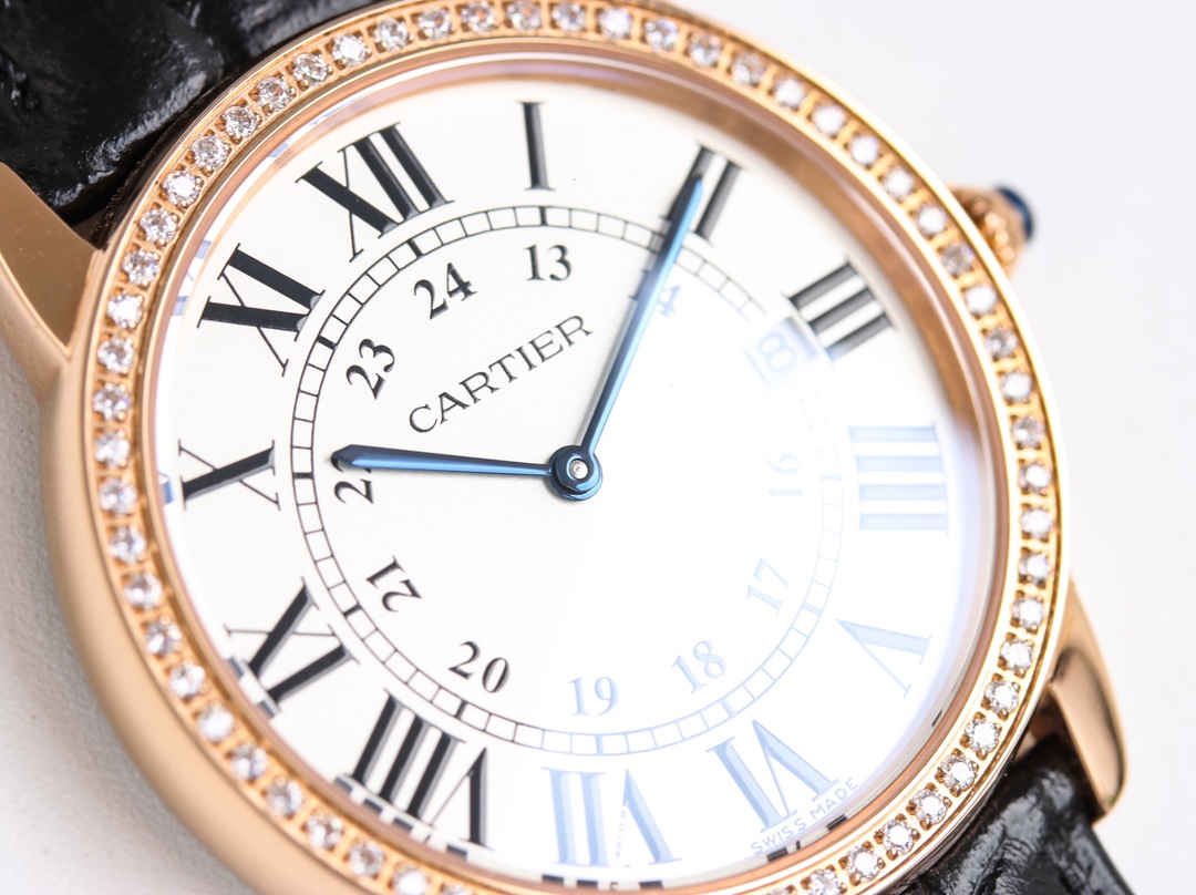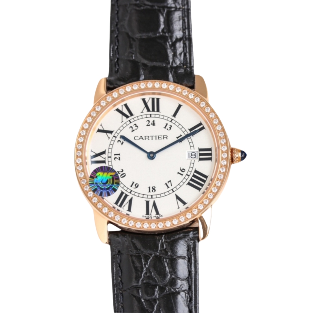 | Cartier Ronde Steel 36mm 29mm White Dial Diamond Rose Gold Bezel Black Leather Strap WDRN0013 | |