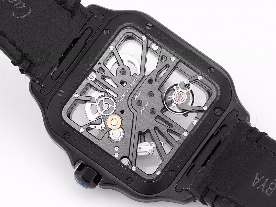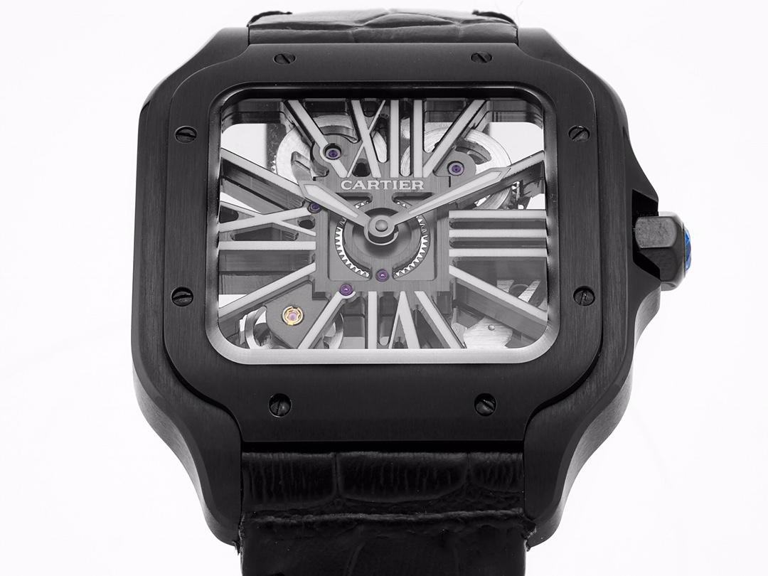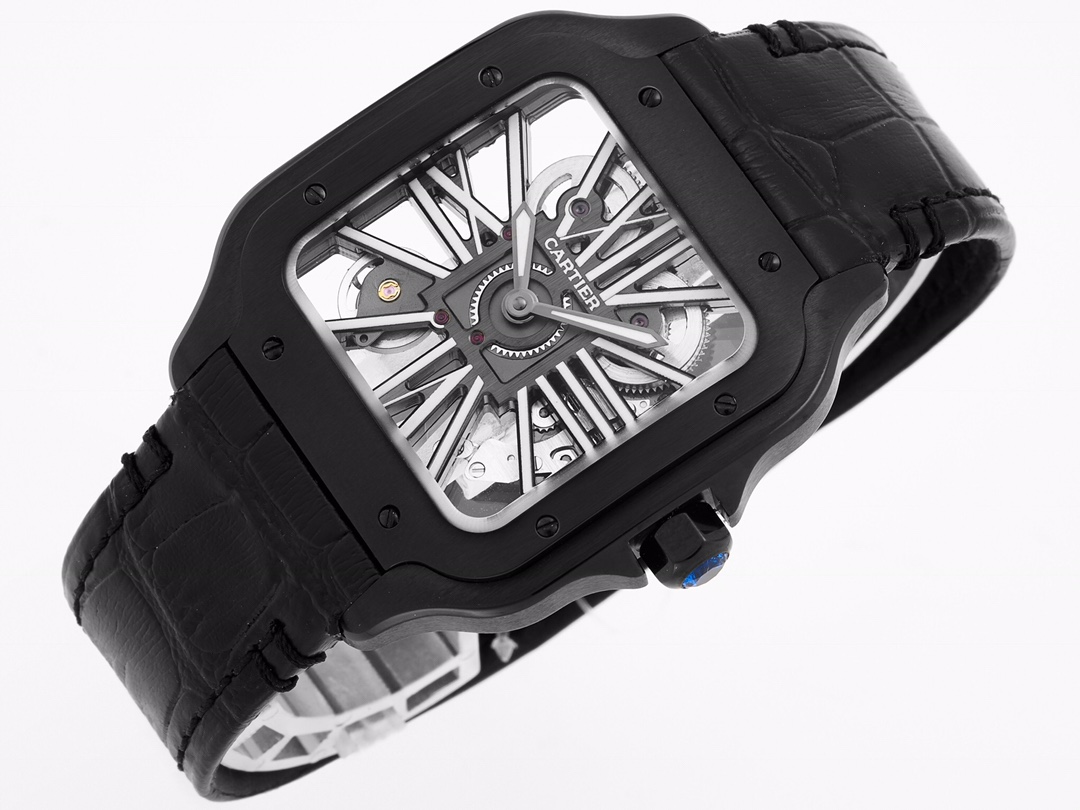 | Cartier Santos 39.8mm Hollow Dial Black Carbon Coating Bezel Black Leather Strap WHSA0009 | |