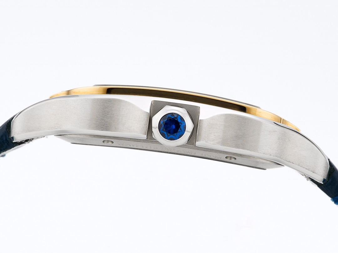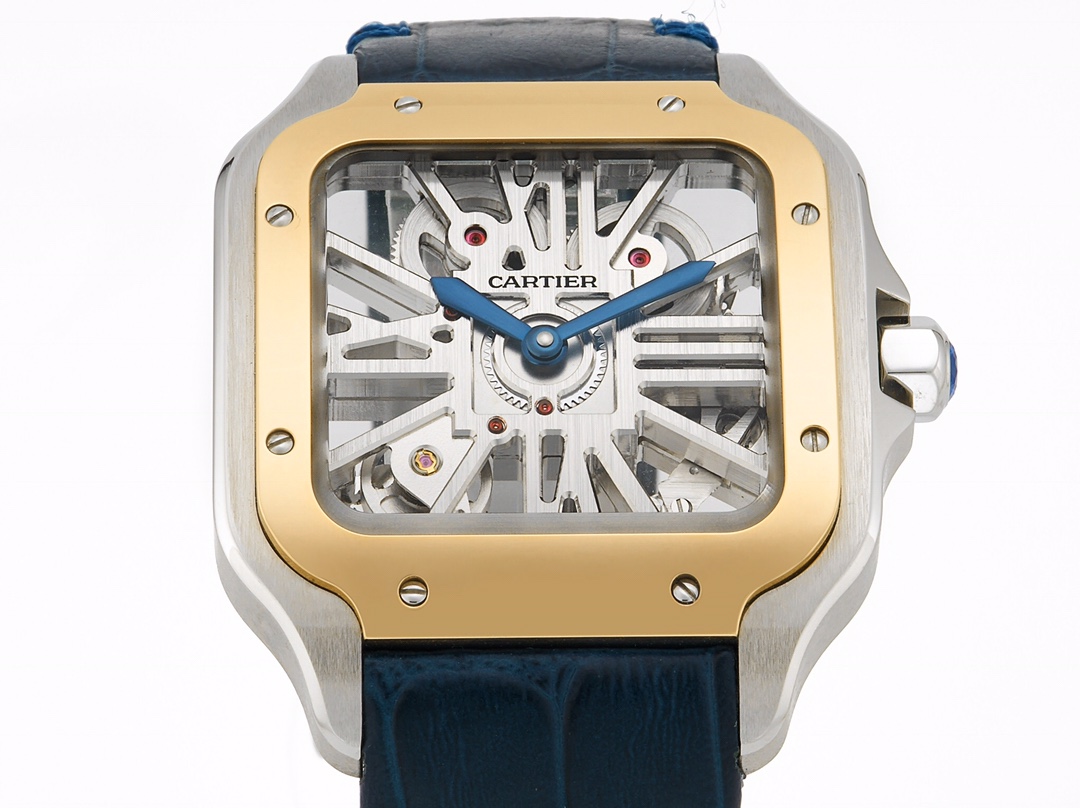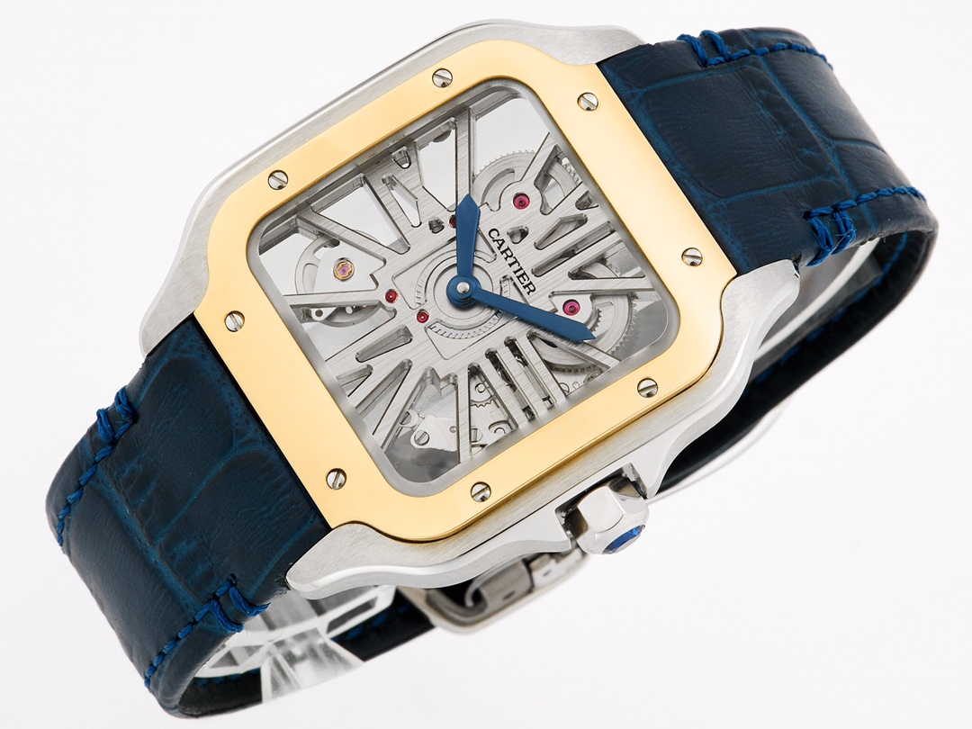 | Cartier Santos 39.8mm Hollow Dial Yellow Gold & Steel Bezel Blue Leather Strap WHSA0024 | |