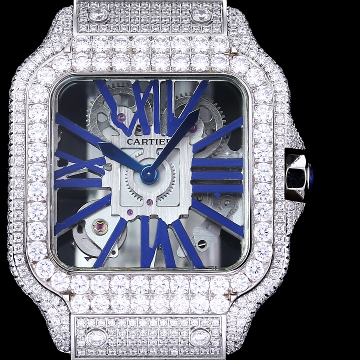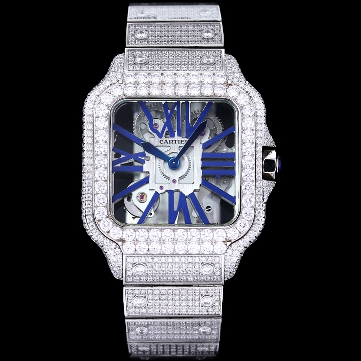 Cartier Santos Full Diamond 39.8mm Steel Button Blue Pointer