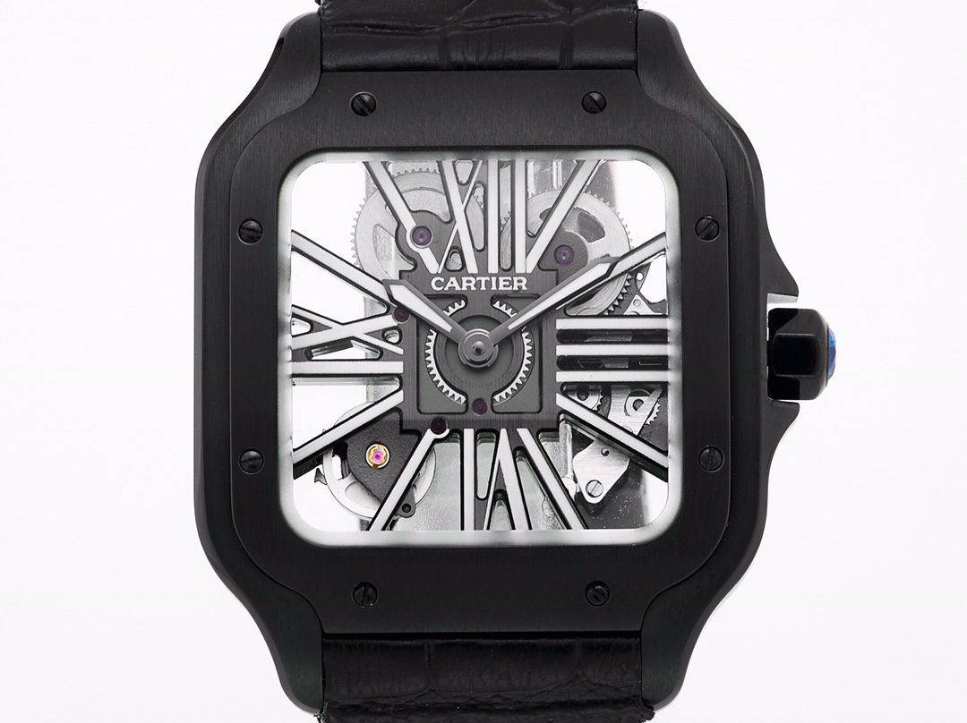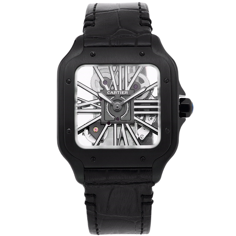 Cartier Santos 39.8mm Hollow Dial Black Carbon Coating Bezel Black Leather Strap WHSA0009