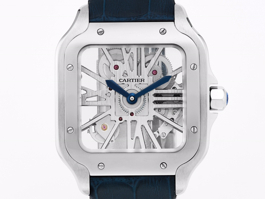 Cartier Santos 39.8mm Hollow Dial Steel Bezel Blue Leather Strap WHSA0021