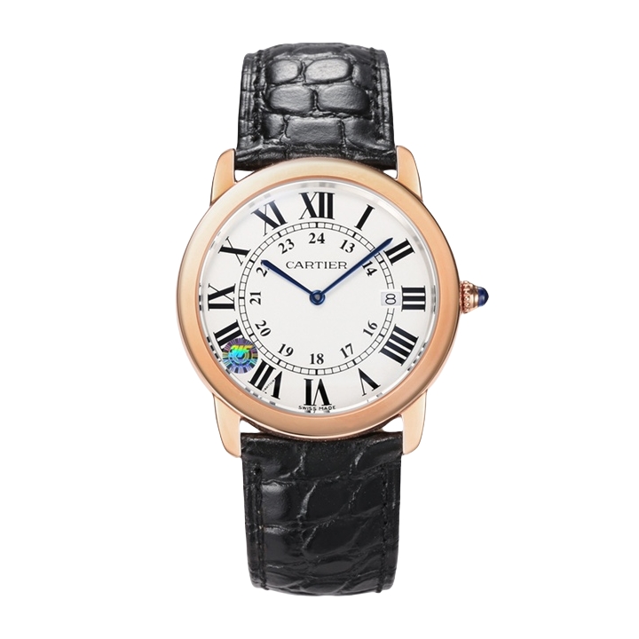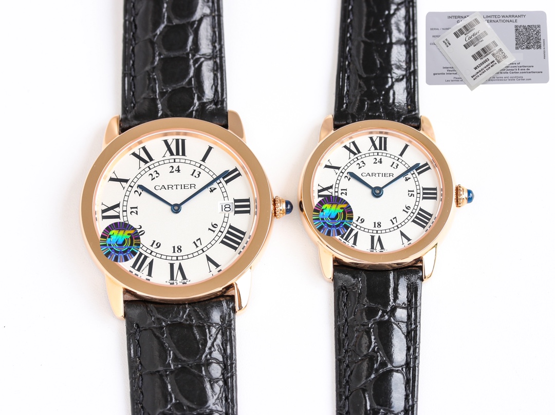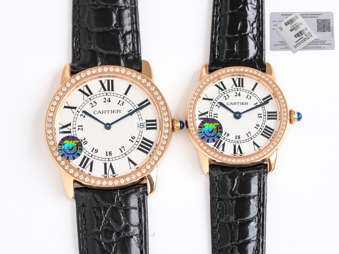 Cartier Ronde Steel 36mm 29mm White Dial Diamond Rose Gold Bezel Black Leather Strap WDRN0013