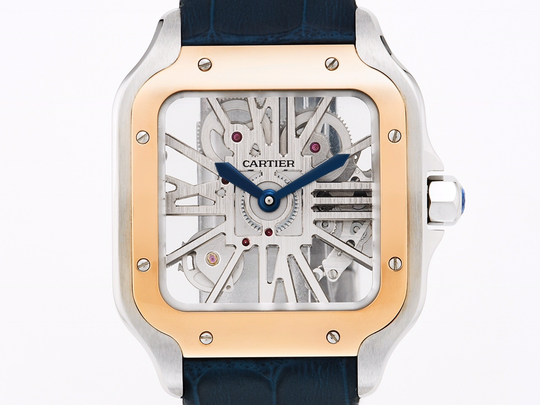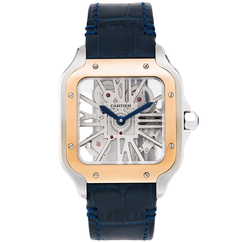 Cartier Santos 39.8mm Hollow Dial Rose Gold & Steel Bezel Blue Leather Strap WHSA00XX