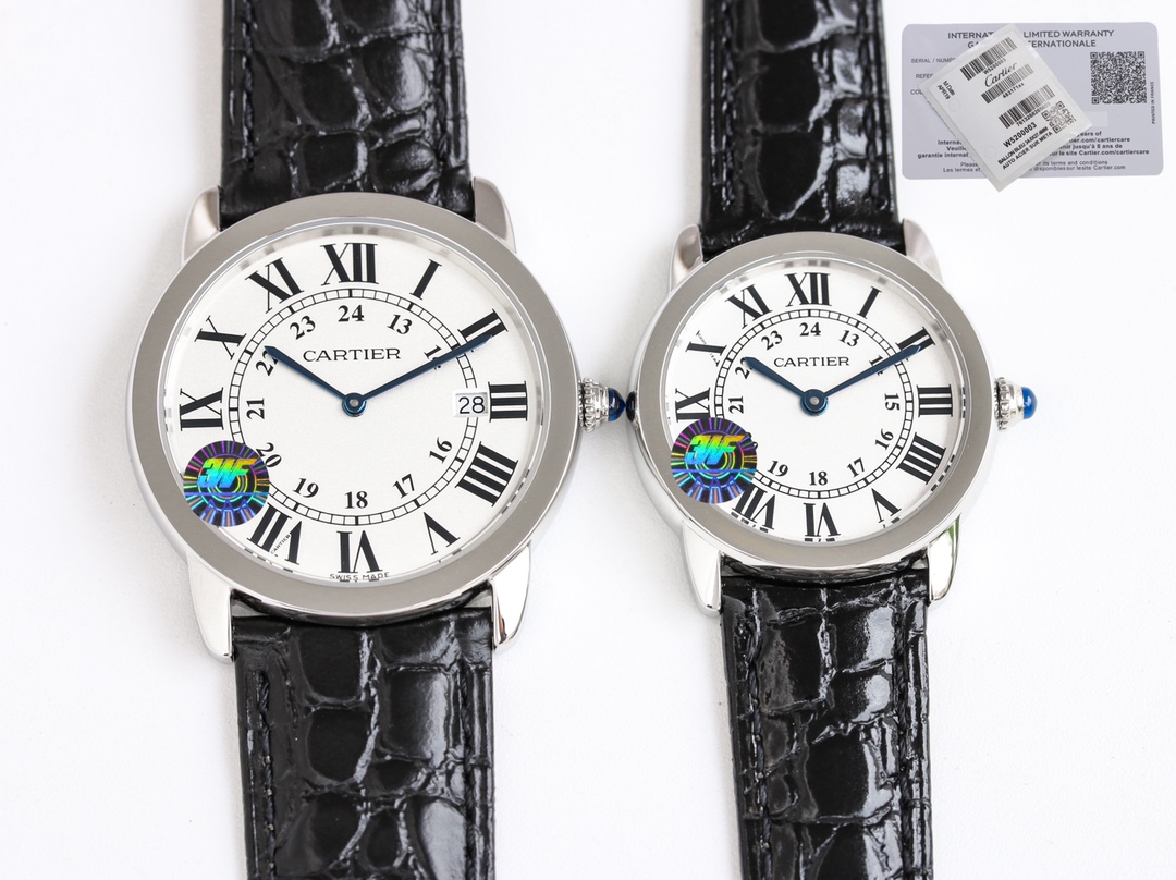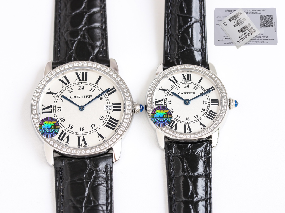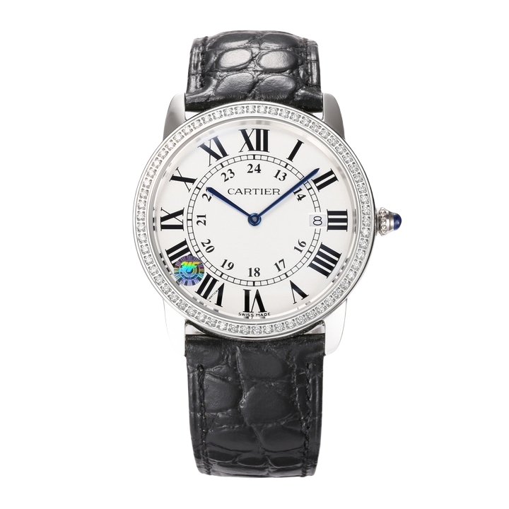 Cartier Ronde Steel 36mm 29mm White Dial Diamond Steel Bezel Black Leather Strap WDRN0013