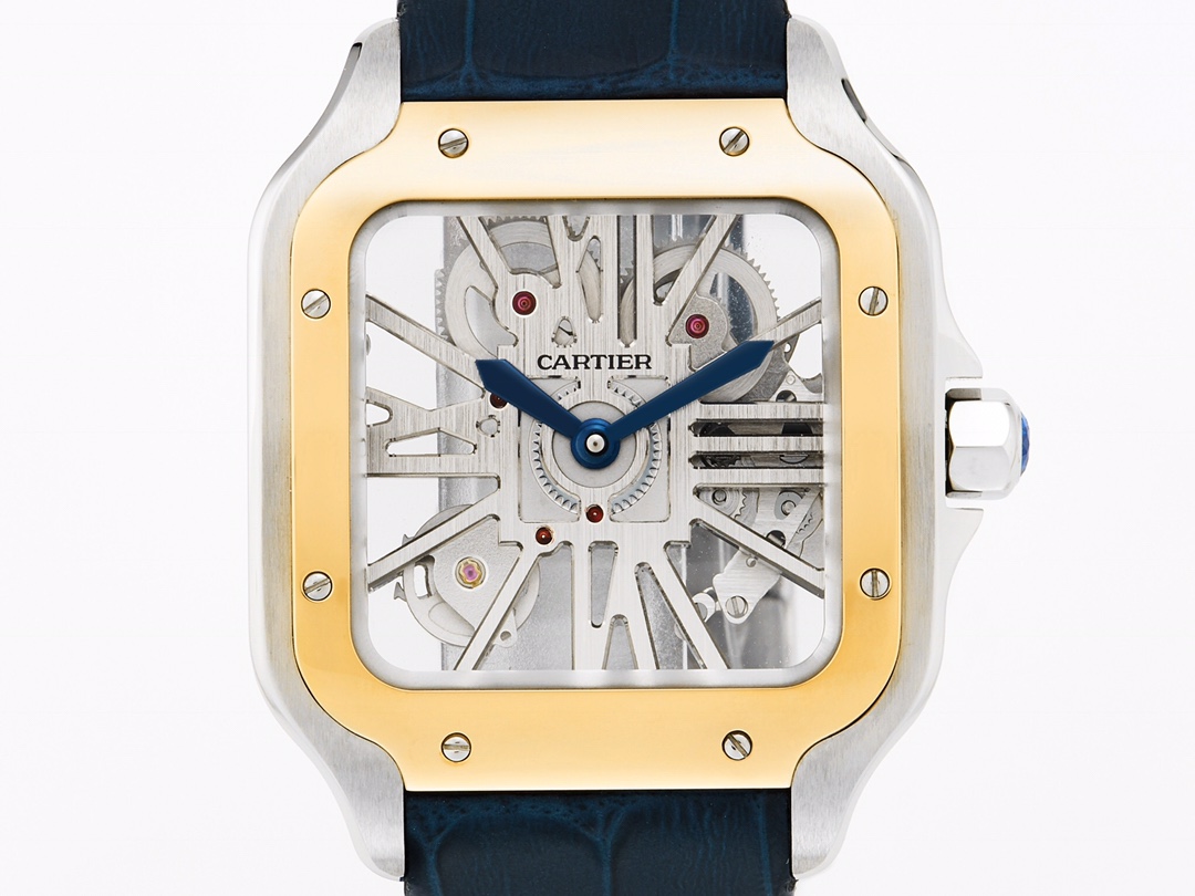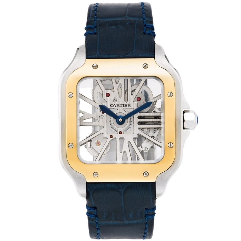 Cartier Santos 39.8mm Hollow Dial Yellow Gold & Steel Bezel Blue Leather Strap WHSA0024