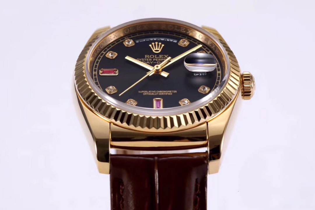 | Rolex Day-Date 36mm 40mm Dial Black Diamond Ruby Yellow Gold Brown Leather 118138 | |