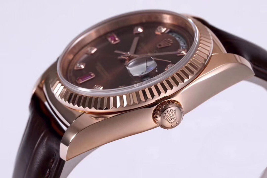 | Rolex Day-Date 36mm 40mm Dial Chocolate Diamond Ruby Rose Gold Brown Leather 118135-0022 | |