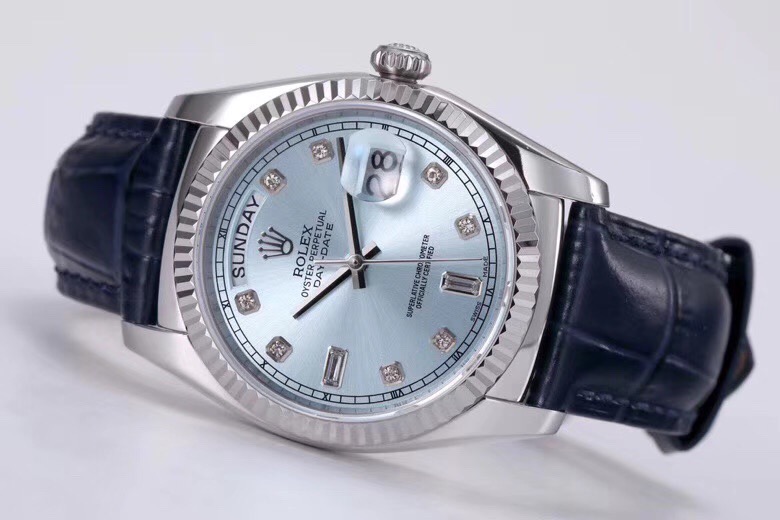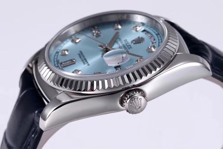 • Rolex Day-Date 36mm 40mm Dial Diamond Ice Blue Platinum Blue Leather 118139