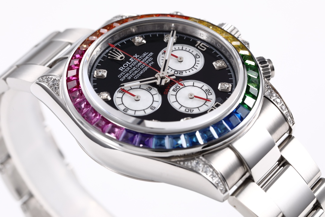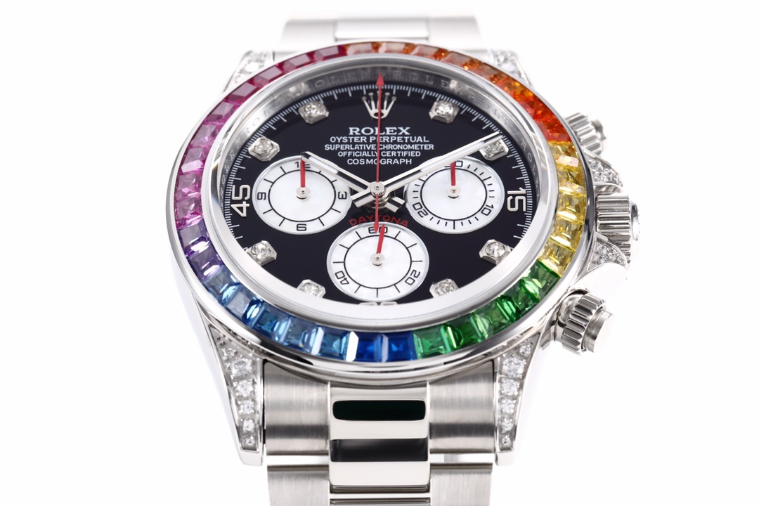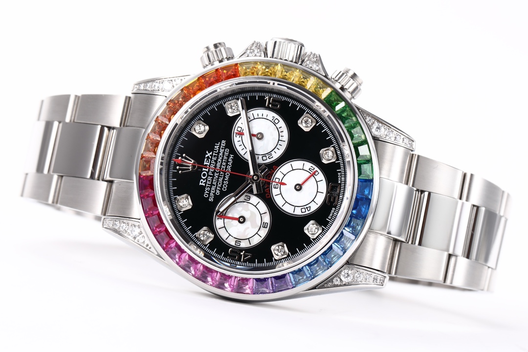 | Rolex Daytona Rainbow 40mm Black Dial Platinum Diamond Bezel Steel Strap 116599RBOW | |