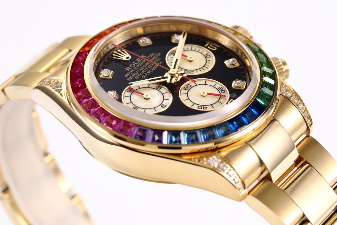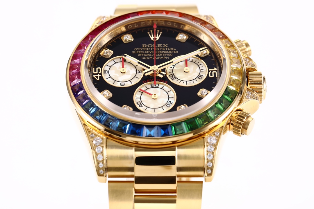 | Rolex Daytona Rainbow 40mm Black Dial Yellow Gold Diamond Bezel 116598RBOW | |