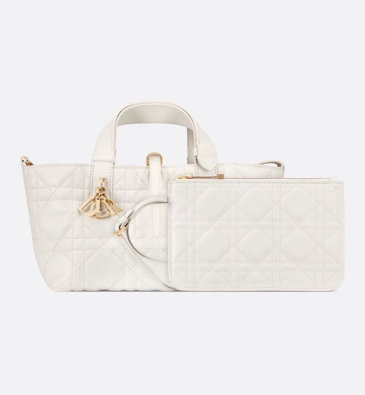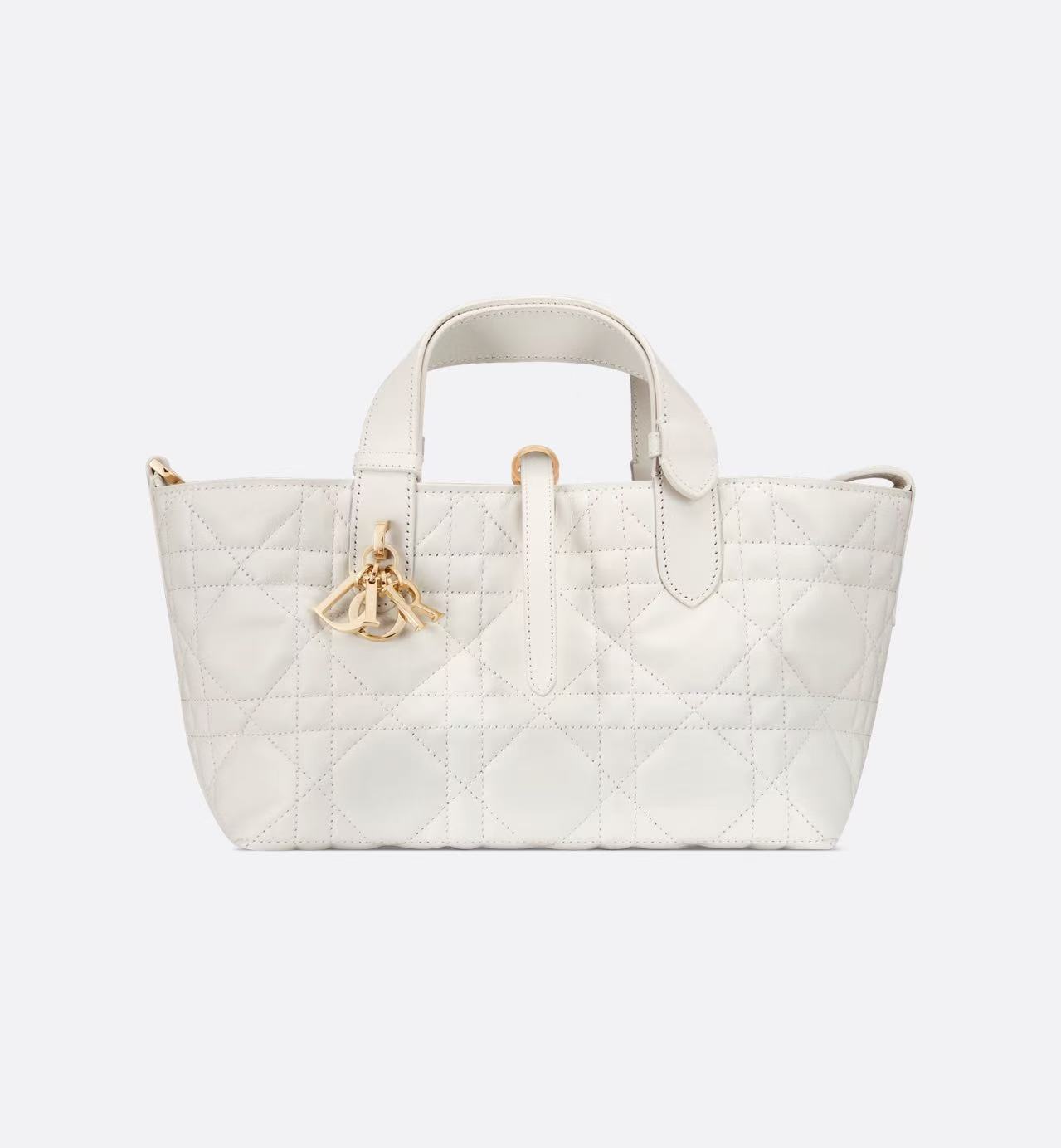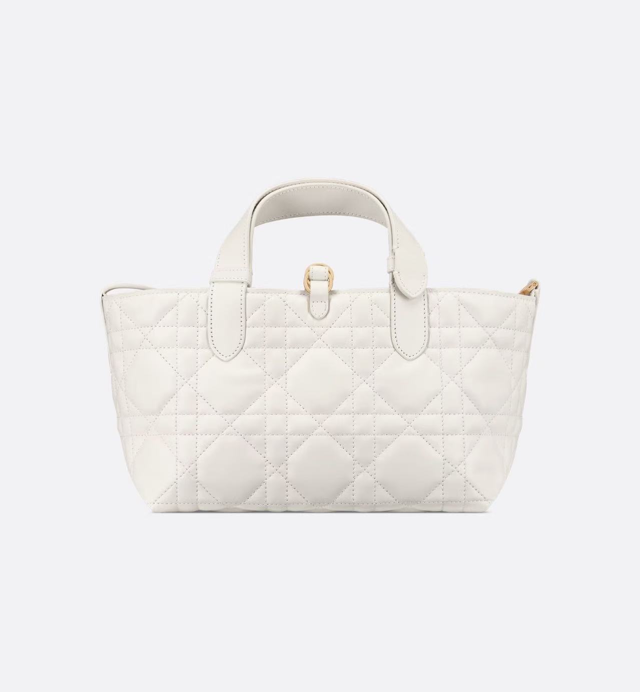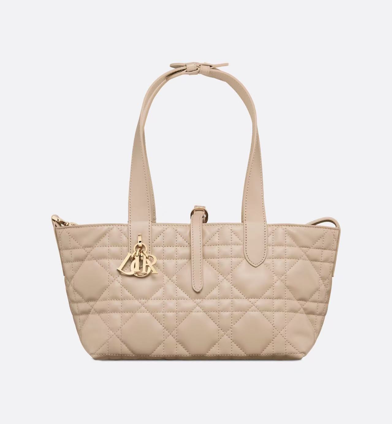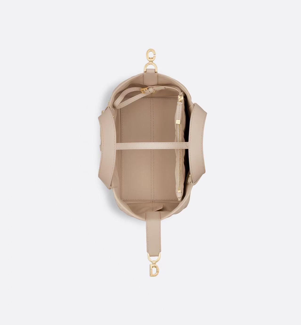 This Dior Toujours handbag is casual and practical, with a unique touch. Expertly crafted from blush beige calfskin leather with oversized cannage stitching, it features spacious interior compartments with pouches to neatly organize everyday essentials. It features a slim leather tie closure for secure storage, and a CD Lock, a "CD Lock" knob-style clasp that adjusts the sides for a refined silhouette. In the smaller size, the top leather handle features an adjustable detail for easy hand carry.