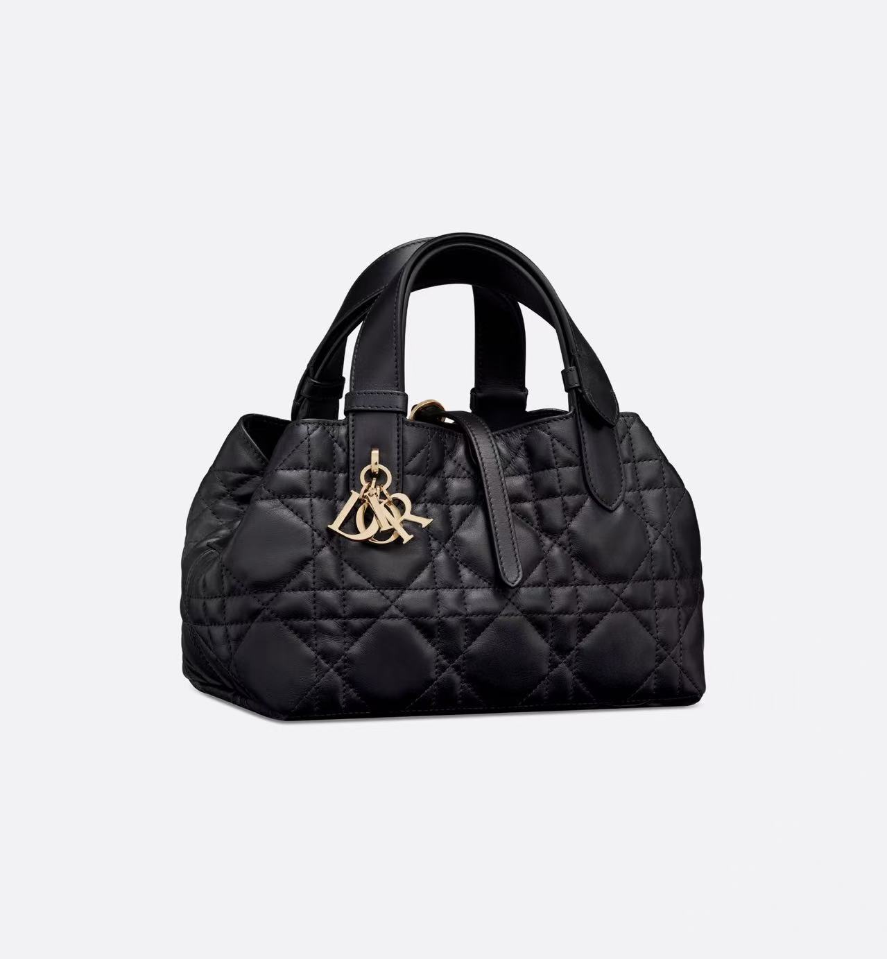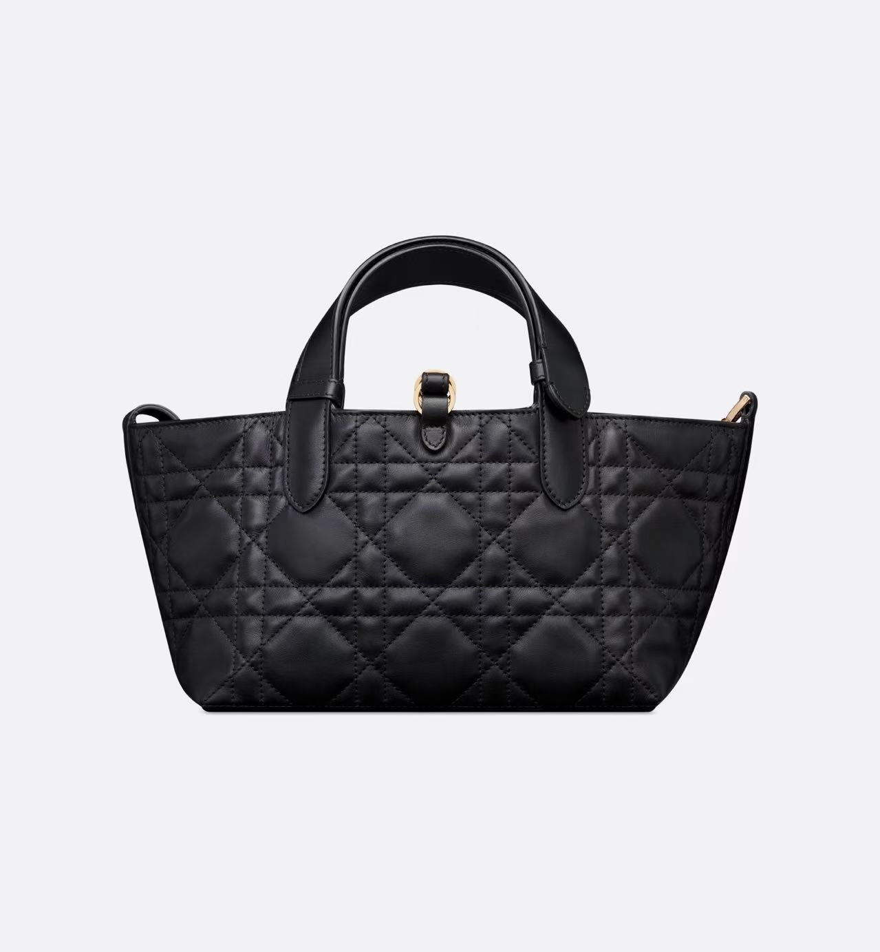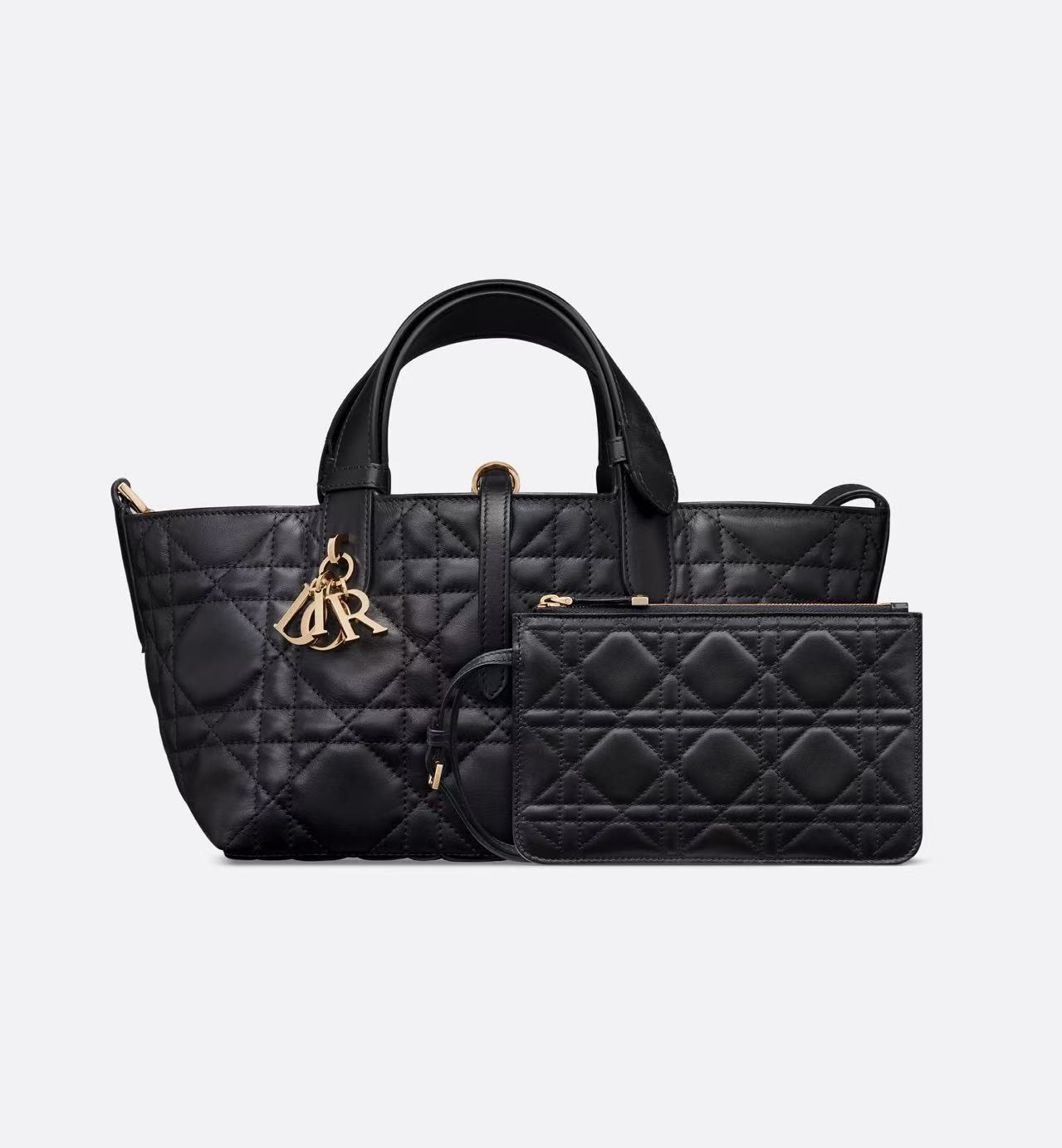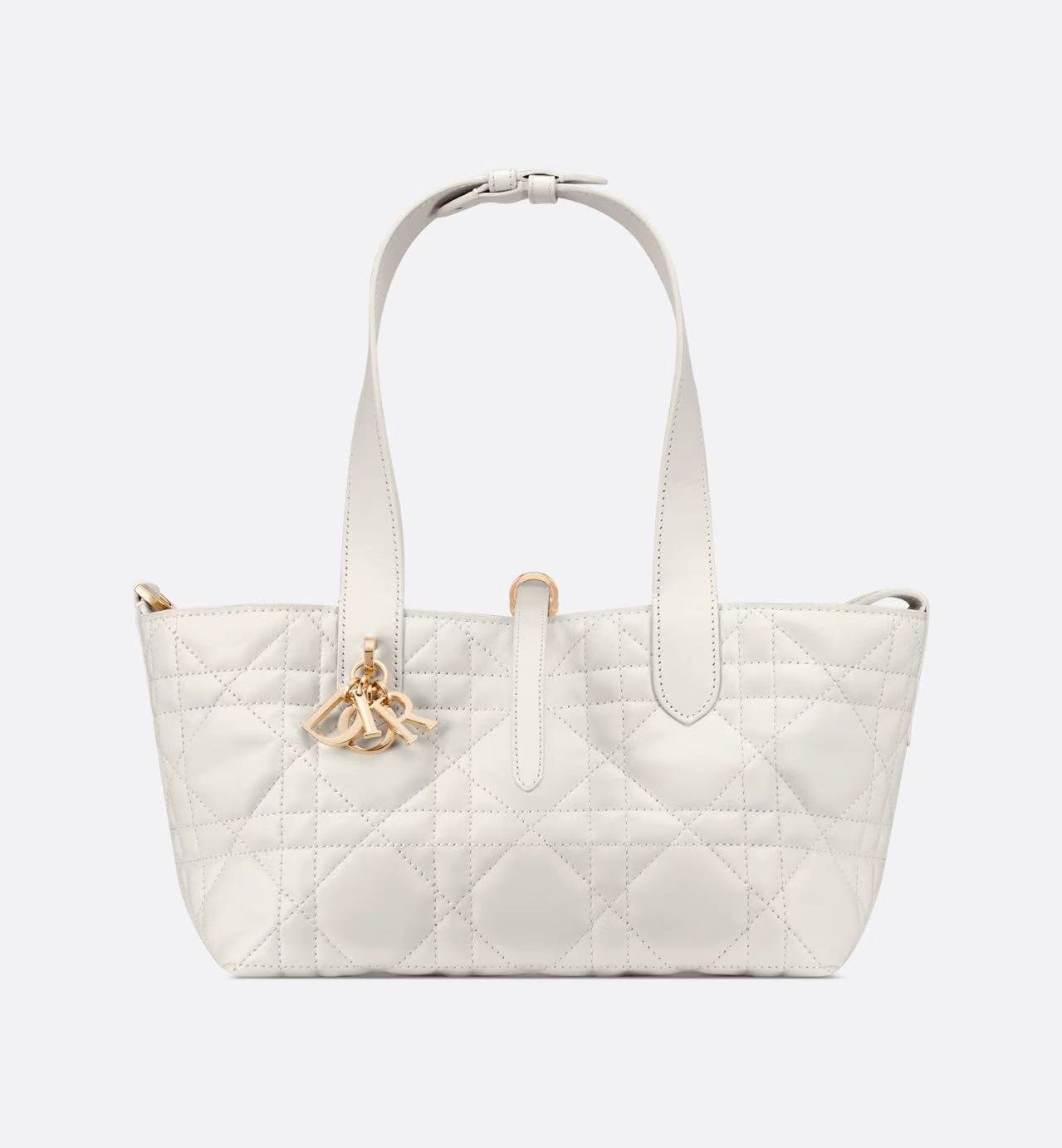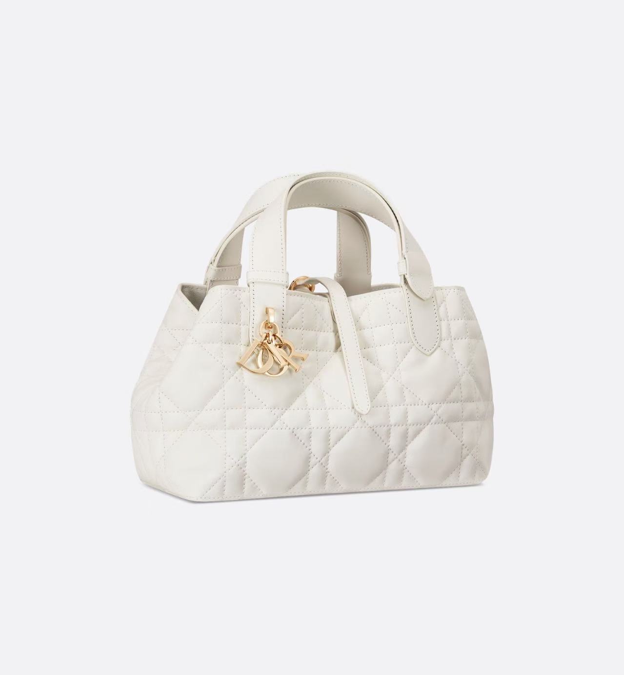 This Dior Toujours handbag is casual and practical, with a unique touch. Expertly crafted from blush beige calfskin leather with oversized cannage stitching, it features spacious interior compartments with pouches to neatly organize everyday essentials. It features a slim leather tie closure for secure storage, and a CD Lock, a "CD Lock" knob-style clasp that adjusts the sides for a refined silhouette. In the smaller size, the top leather handle features an adjustable detail for easy hand carry.