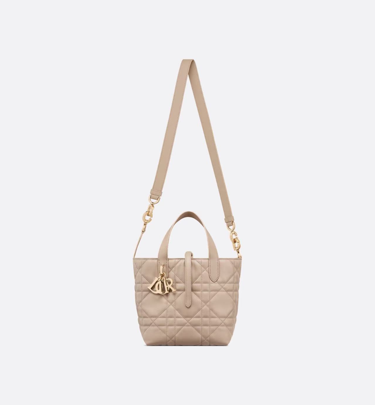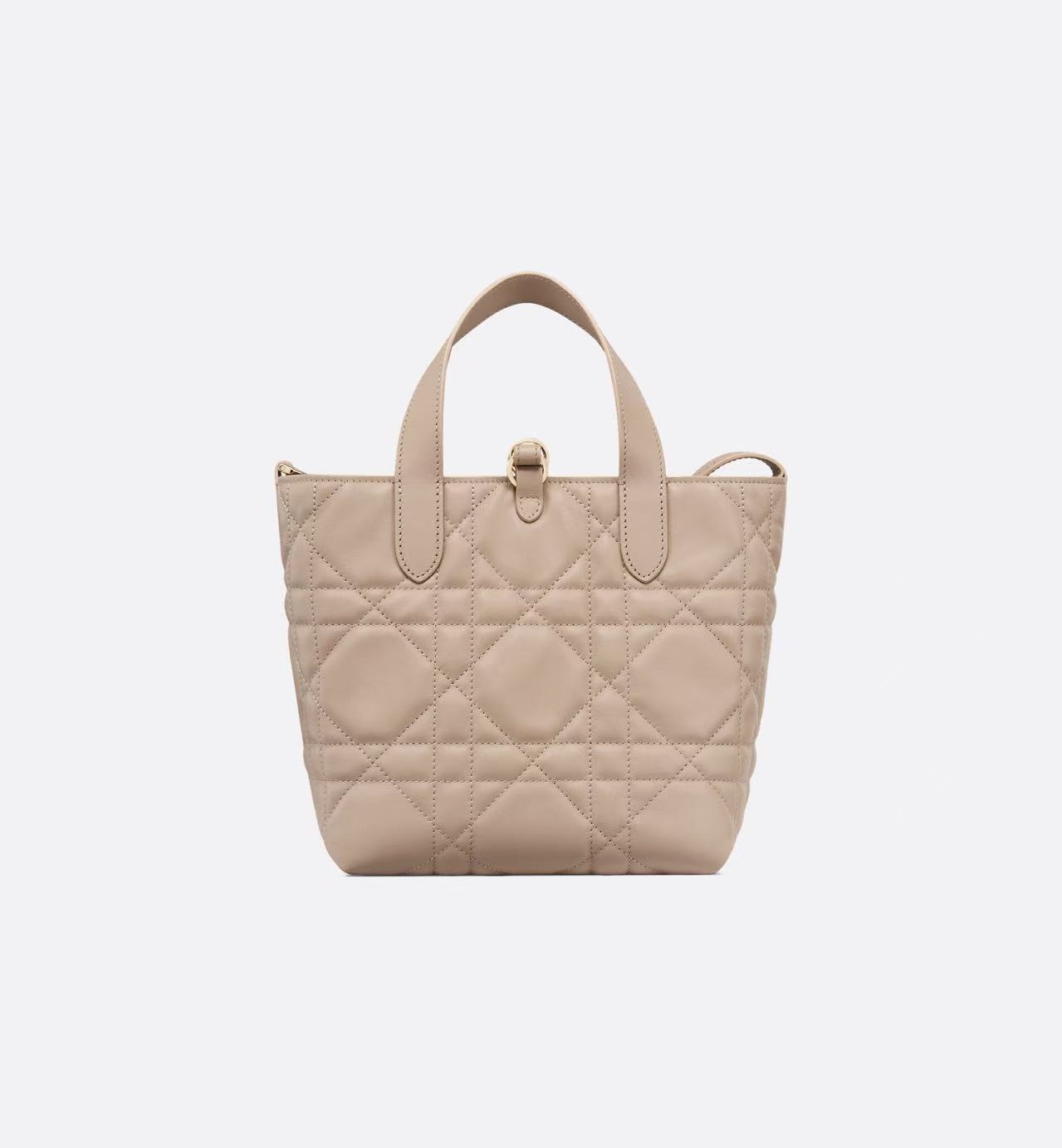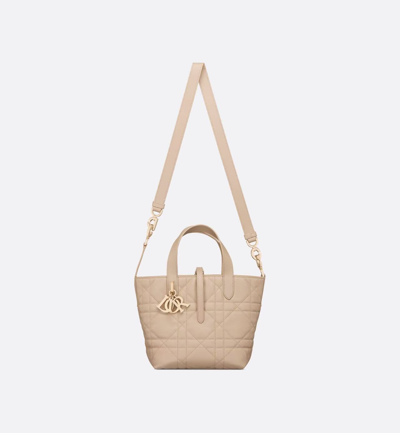 This vertical Dior Toujours bag is stylish and practical, offering a unique touch. Crafted from desert taupe cowhide leather with oversized cannage stitching, it features spacious interior compartments for everyday essentials. It features a slim leather tie closure for secure storage, and a CD Lock D knob-style clasp that adjusts the sides for added style. This small model features a top leather handle with a detachable leather shoulder strap for hand, shoulder, or crossbody wear.