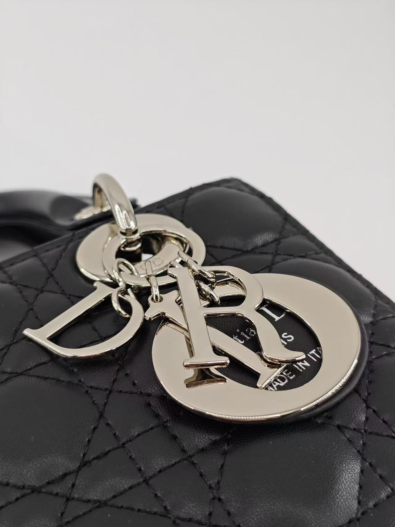 The Lady Dior — My ABCDior handbag epitomizes Dior's profound vision of elegance and beauty. Combining refined elegance with a chic, modern flair, it's a timeless classic. Expertly crafted from leather, it features striking quilting details with cannage stitching, showcasing the meticulous craftsmanship. The signature "D.I.O.R." charm in light gold metal adds a touch of movement to the refined silhouette. A tonal emblem can be added to the shoulder strap for personalization.