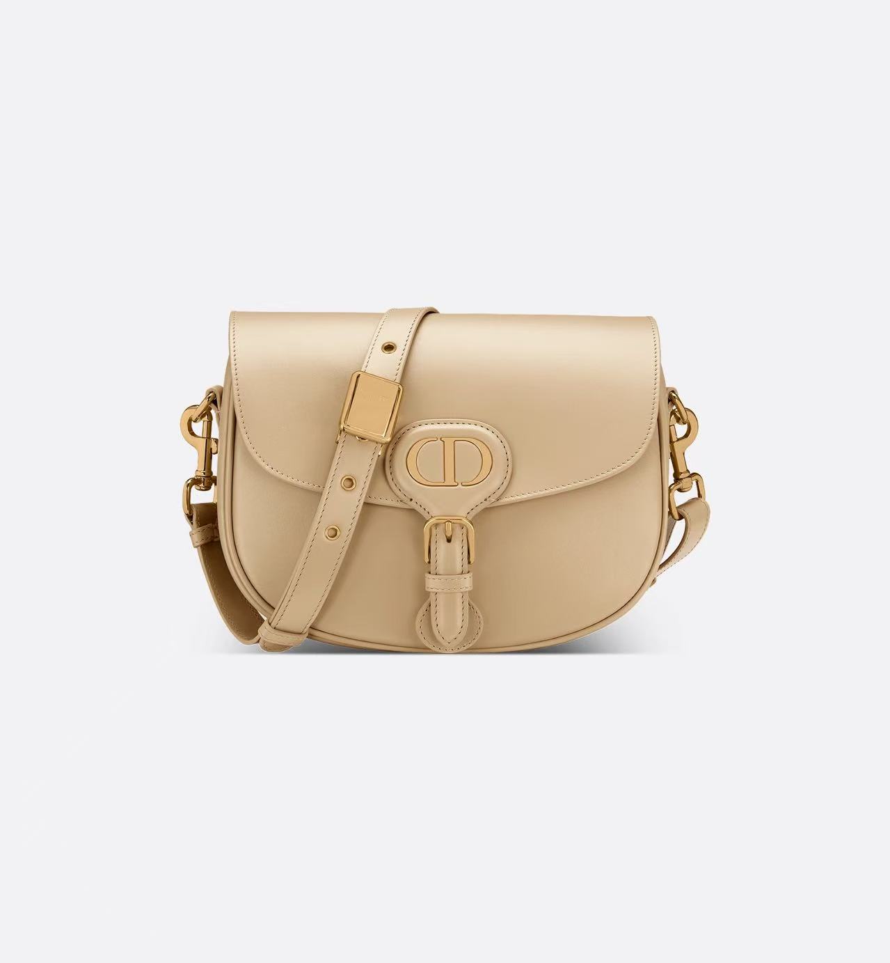 Beige grained calfskin leather with a blue Oblique print embroidered shoulder strap