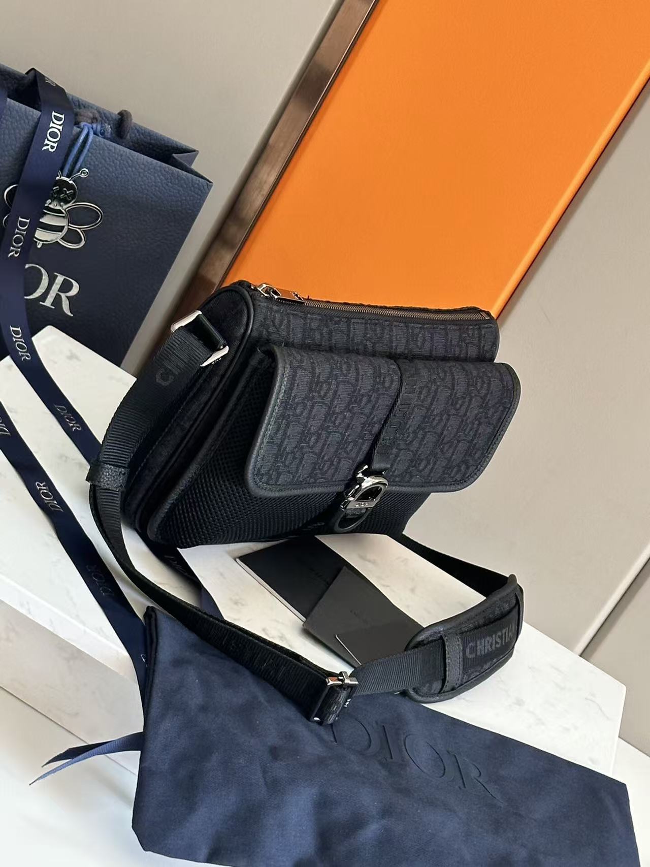 Crafted from beige and black oblique print fabric. Rigid design with zippered compartments for everyday essentials, front flap with Dior 8 buckle and mesh pocket. Mini size with adjustable Christian Dior signature strap for shoulder or crossbody wear.