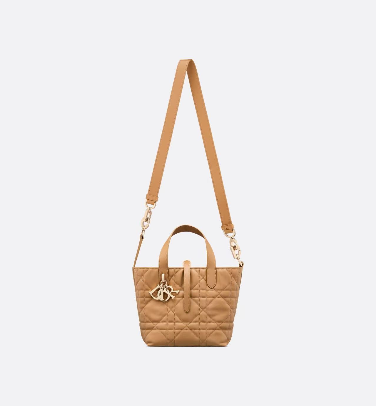 This vertical Dior Toujours bag is stylish and practical, creating a unique style. Expertly crafted from light gold-toned calfskin leather with oversized cannage stitching, it features spacious interior compartments for everyday essentials. It features a slim leather tie closure for secure storage, and a CD Lock D knob-style clasp that adjusts the sides for added style. In its smaller size, it features a top leather handle with a removable leather shoulder strap for hand, shoulder, or crossbody wear.