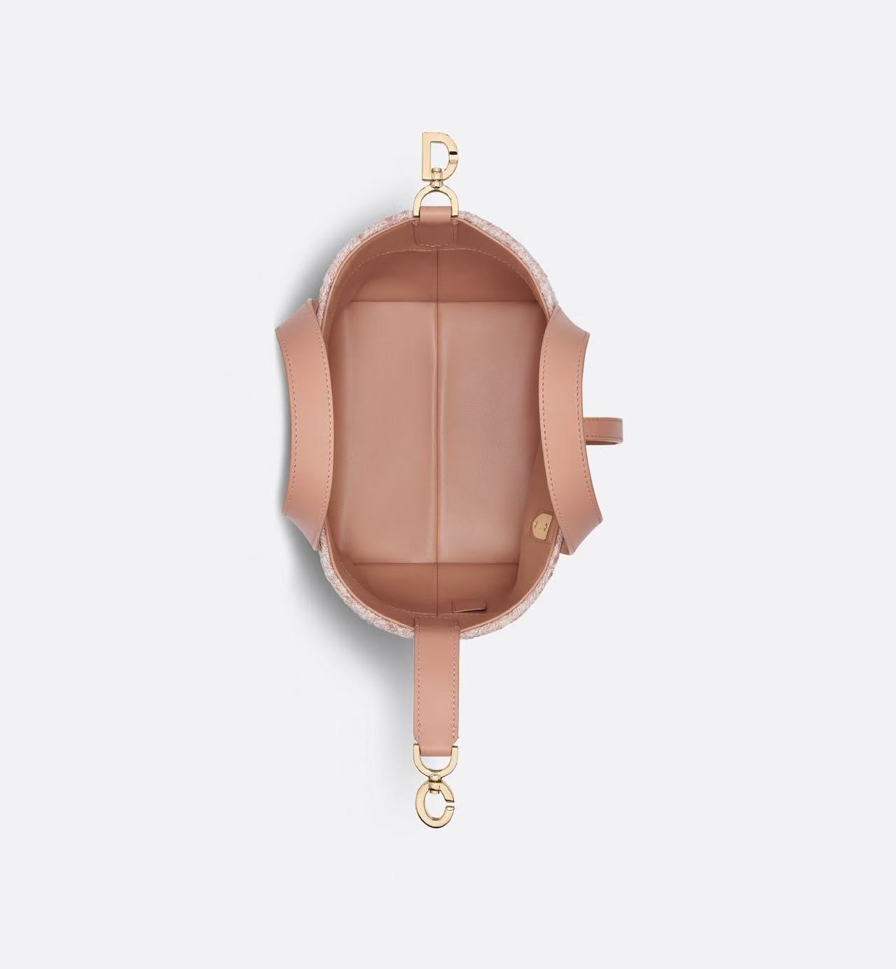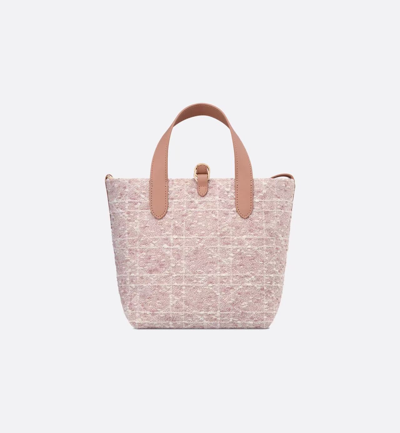 This vertical Dior Toujours bag is stylish and practical, creating a unique style. Crafted from rose-pink twill fabric and embellished with a white cannage pattern, it features spacious interior compartments for everyday essentials. It features a slim leather tie closure for secure storage, and a CD Lock, D-style knob-style clasp that adjusts the sides for added style. The top leather handles and removable leather shoulder strap allow it to be carried by hand, on the shoulder, or across the body.
