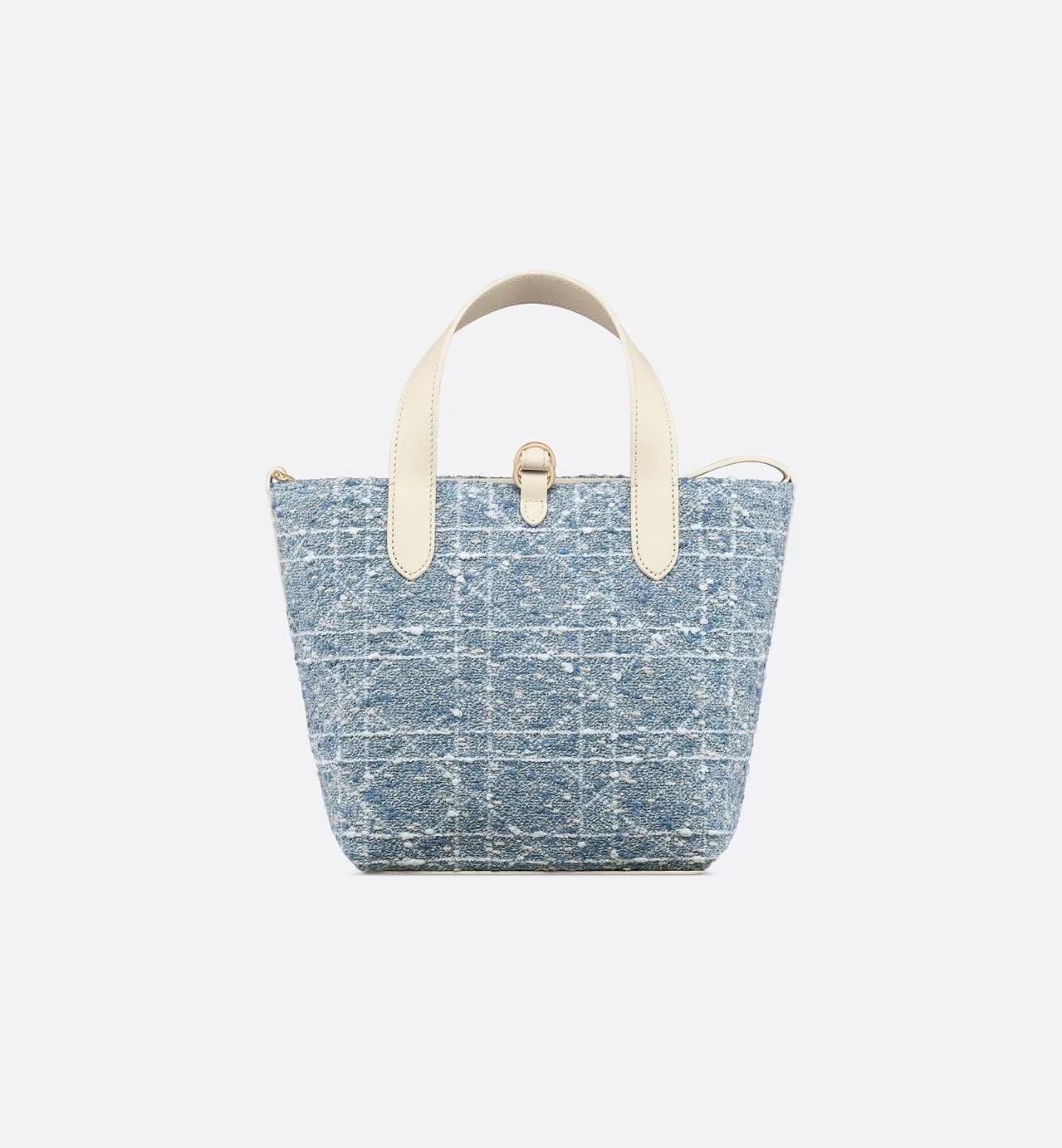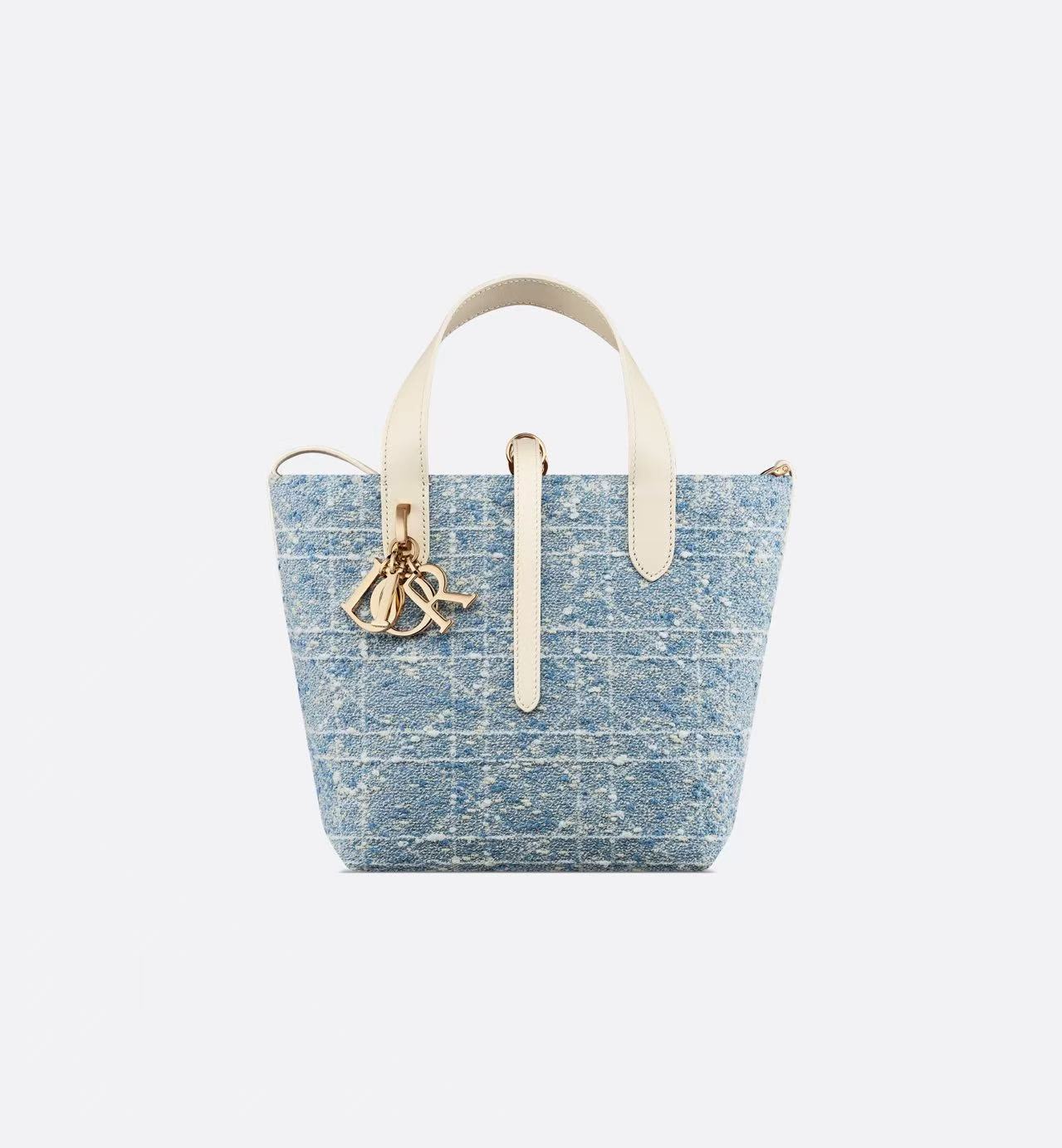This vertical Dior Toujours bag is stylish and practical, offering a unique touch. Crafted from space blue tweed and embellished with a white cannage pattern, it features spacious interior compartments for everyday essentials. It closes with a slim leather strap for secure storage, and features a CD Lock D knob clasp that adjusts the sides for a more refined silhouette. This small size features a beige cowhide top handle and a detachable leather shoulder strap for hand, shoulder, or crossbody wear.