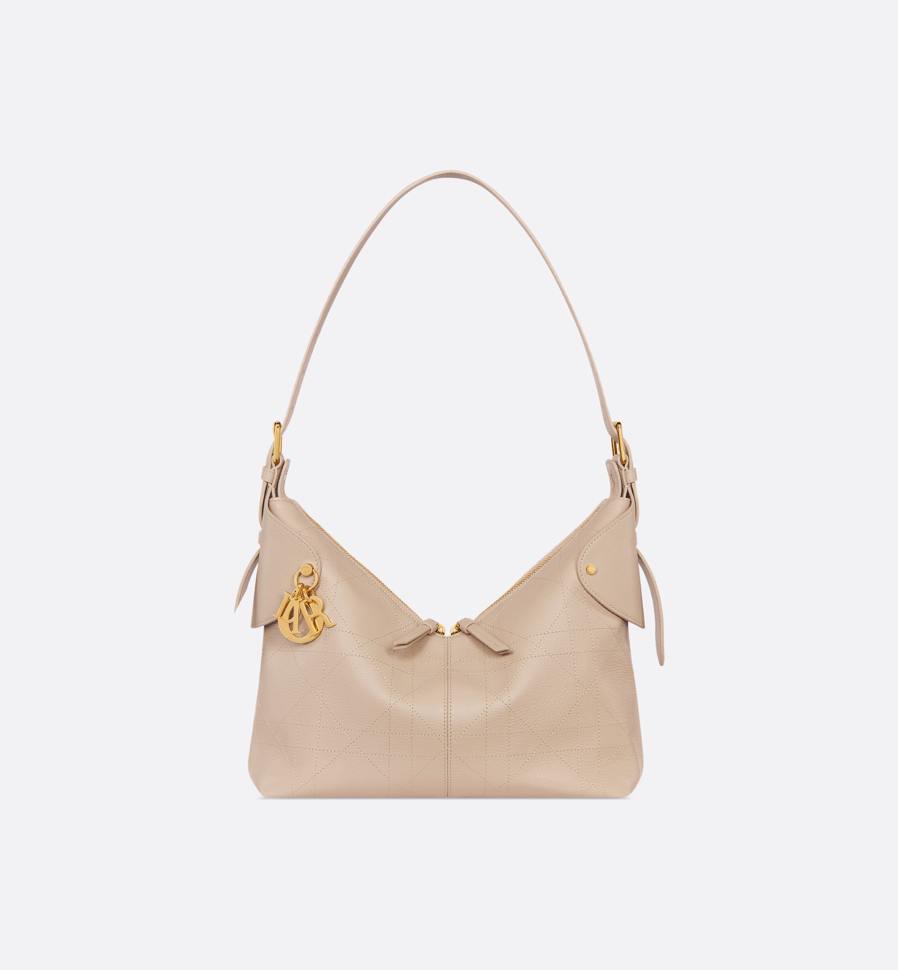A new addition to the Cruise 2026 Ready-to-Wear collection, the Dior Voyage handbag blends soft lines with elegant details to create a harmonious silhouette. Expertly crafted from cream grained calfskin, this handbag features flat oversized cannage topstitching, a fresh interpretation of Dior's signature motif. The soft silhouette is enhanced by the D.I.O.R. charm in antique gold-tone metal and fine leather accents, adding dimension. The main compartment closes with a secure and practical two-way zipper. The small version features an adjustable top handle with buckle for shoulder carry, making it an ideal everyday accessory.