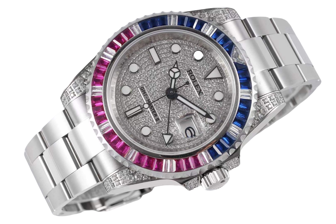 • Rolex GMT-MASTER II 40mm Full Diamond Dial Blue Red Diamond Bezel Steel 116759-SARU