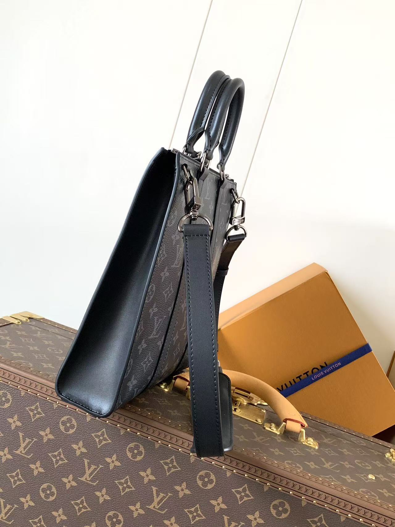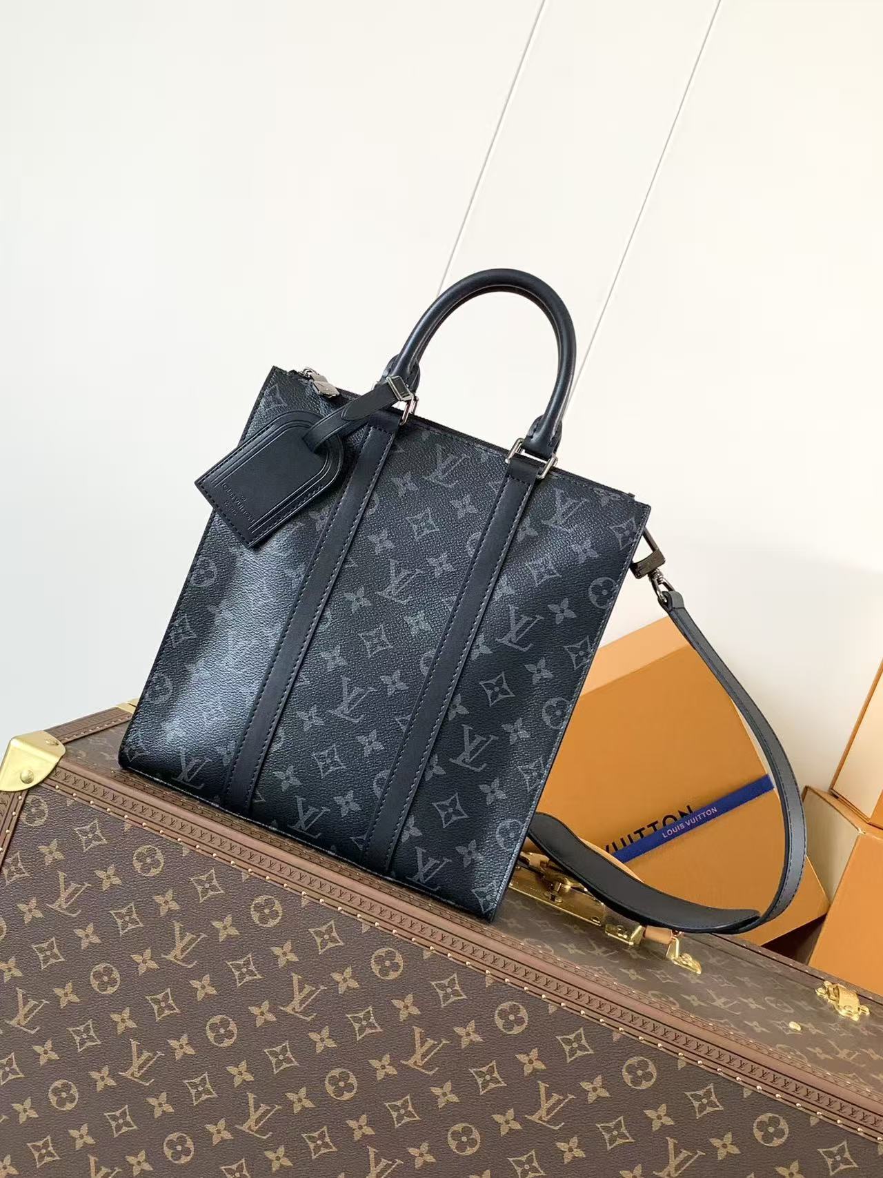 Inspired by the Louis Vuitton Sac Plat bag, this elegant design is crafted from Monogram Eclipse Reserve canvas. Reinforced leather straps and a designer plaque maintain traditional details, complementing the wide zippered opening. A detachable shoulder strap allows for versatile carrying options. Features Monogram Eclipse Reverse coated canvas, cowhide leather trim, fabric lining, hardware, a zipper closure, a large main compartment, an interior patch pocket, a detachable designer plaque, and a detachable, adjustable shoulder strap. Model: M46098 Black Floral; Dimensions: 26 x 28.5 x 6 cm