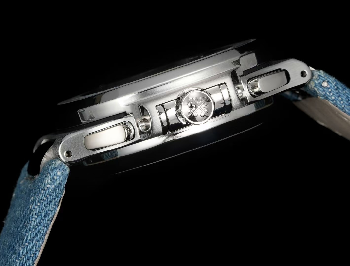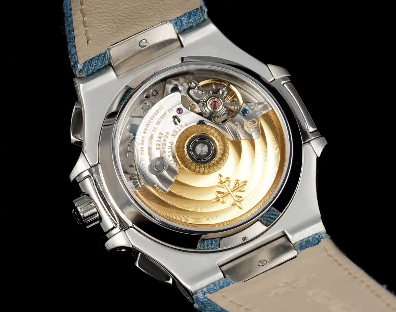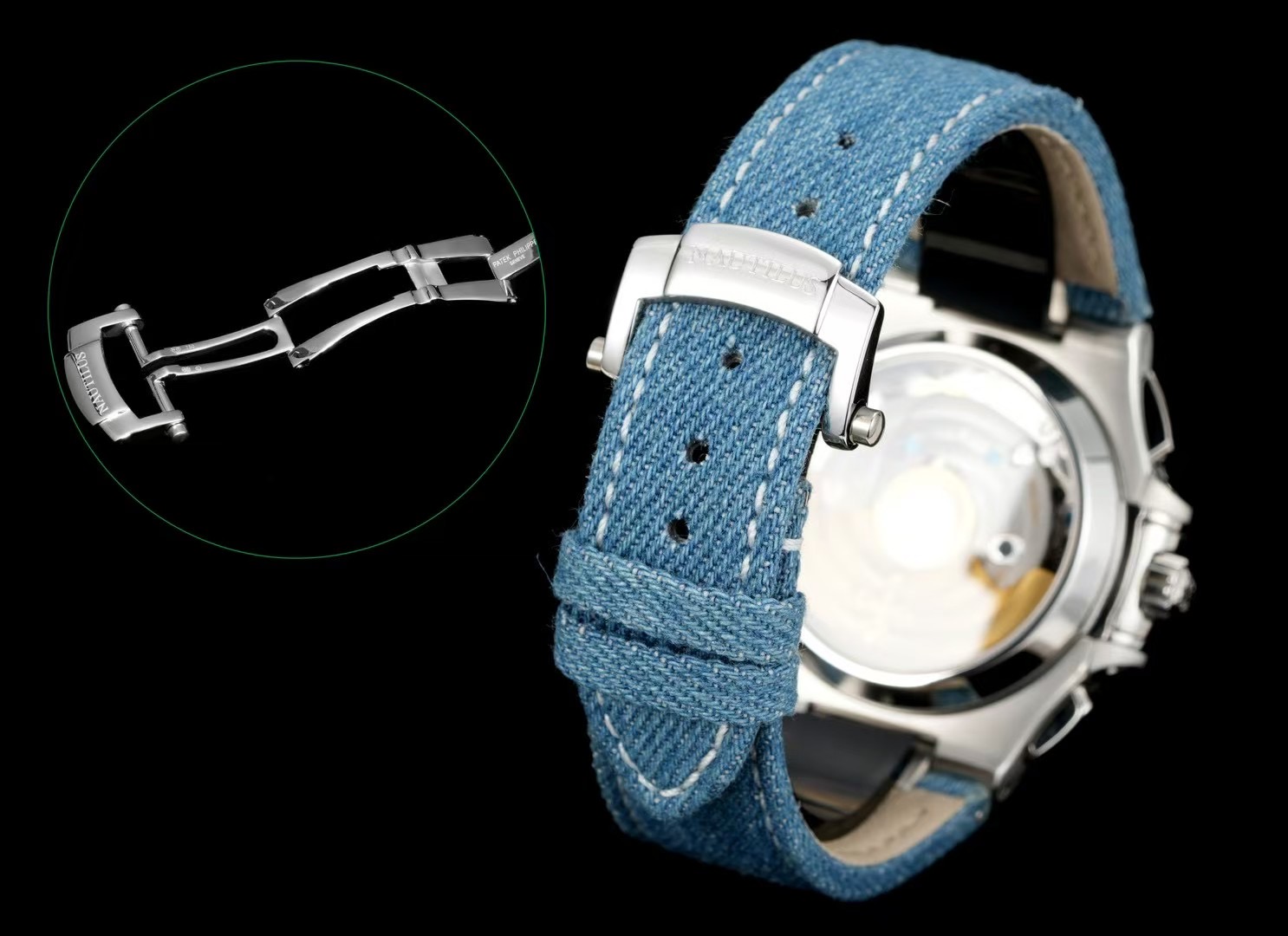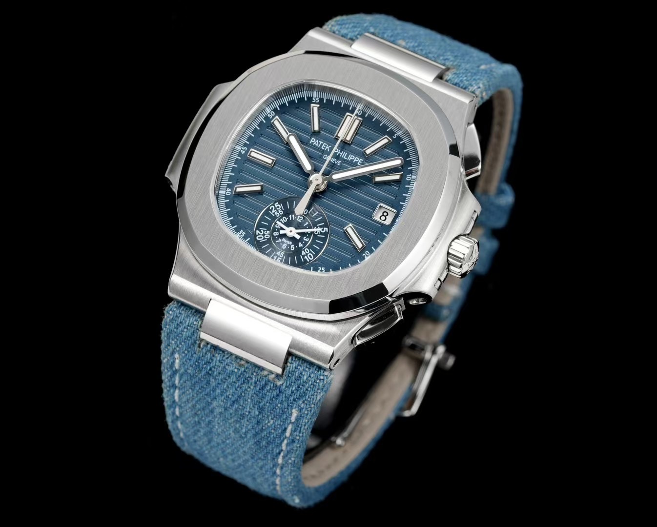 | Patek Philippe Nautilus 40.5mm Blue Dial Steel Bezel Blue Denim Strap 5980/60G-001 | |