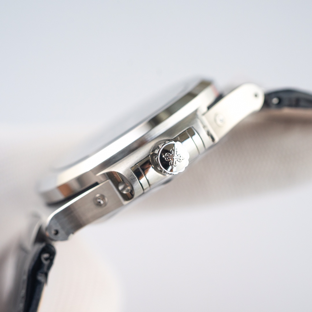 | Patek Philippe Nautilus 40mm Black Grey Dial Steel Bezel Black Leather Moon Phase 5726A-001 | |