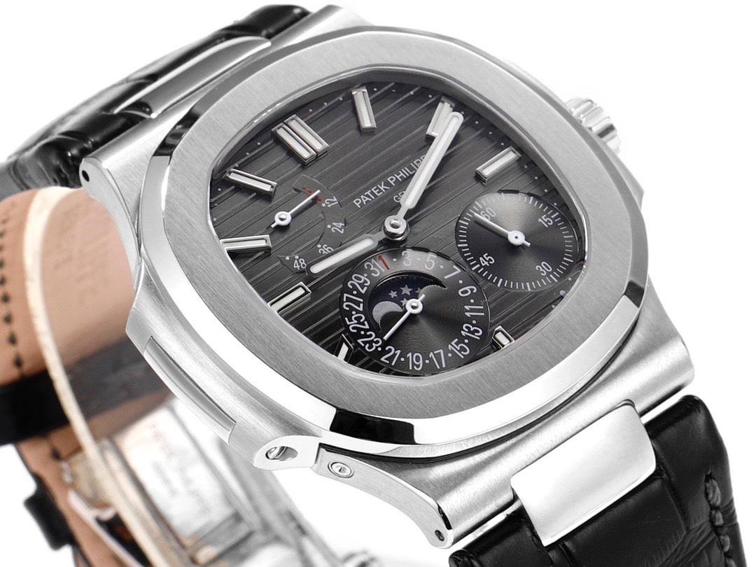 | Patek Philippe Nautilus 40mm Black Moon Phase Dial Platinum Bezel Black Leather 5712G-001 | |