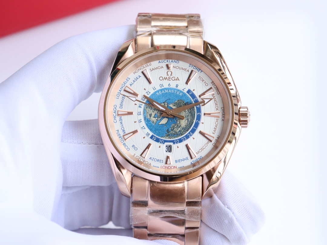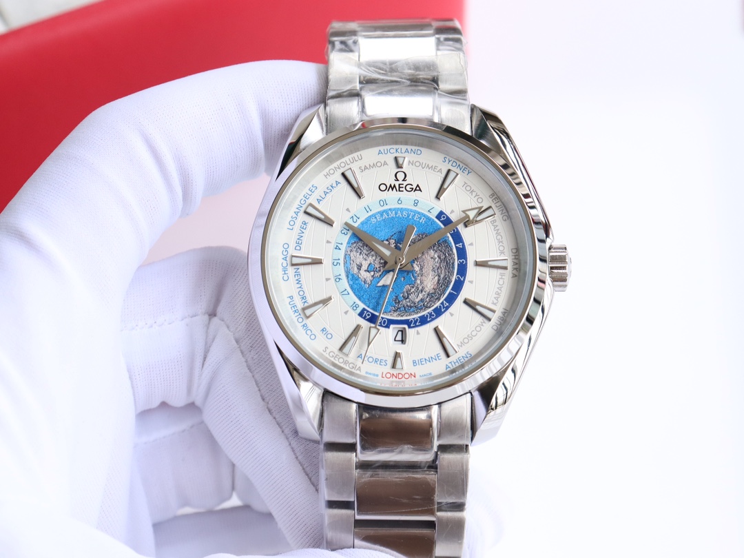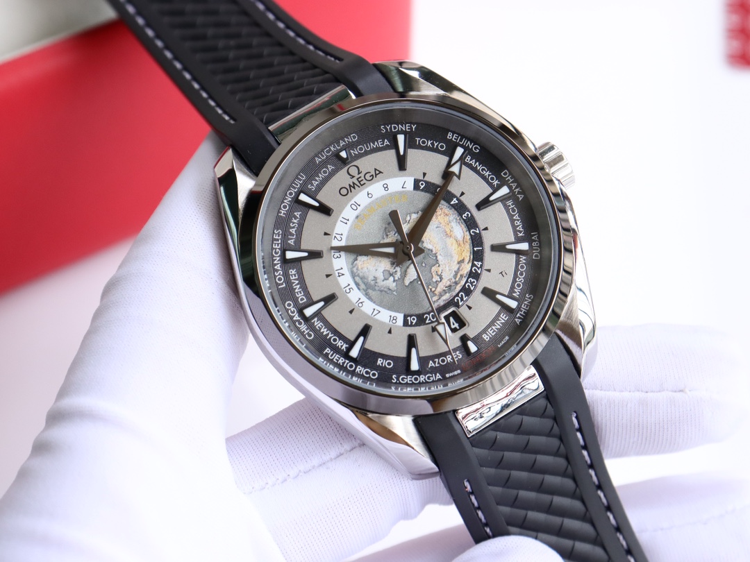 Omega Seamaster Aqua Terra 150M 43mm Silver Black World Timer Dial Platinum Bezel Brown Leather 220.93.43.22.99.001