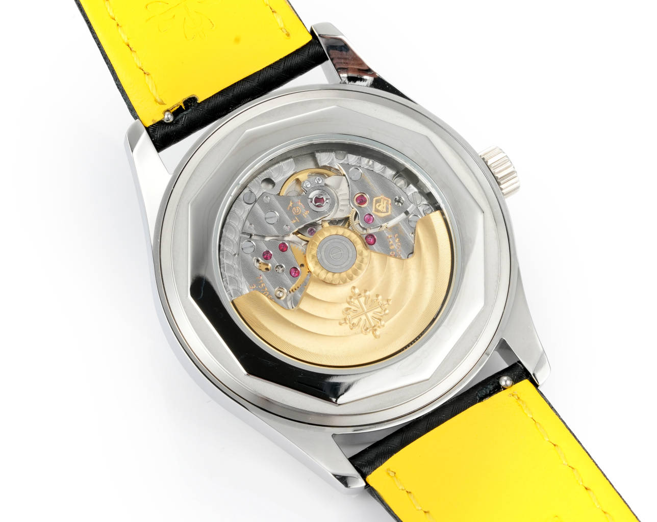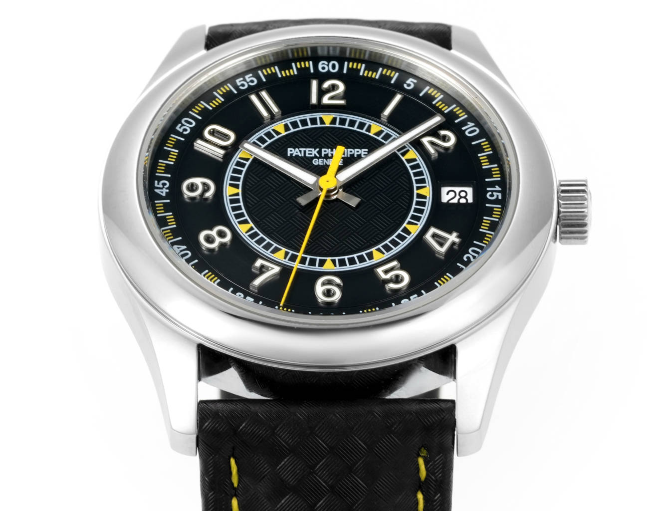 | Patek Philippe Calatrava 40mm Black Yellow Dial Steel Bezel Black Leather Strap 6007G-001 | |