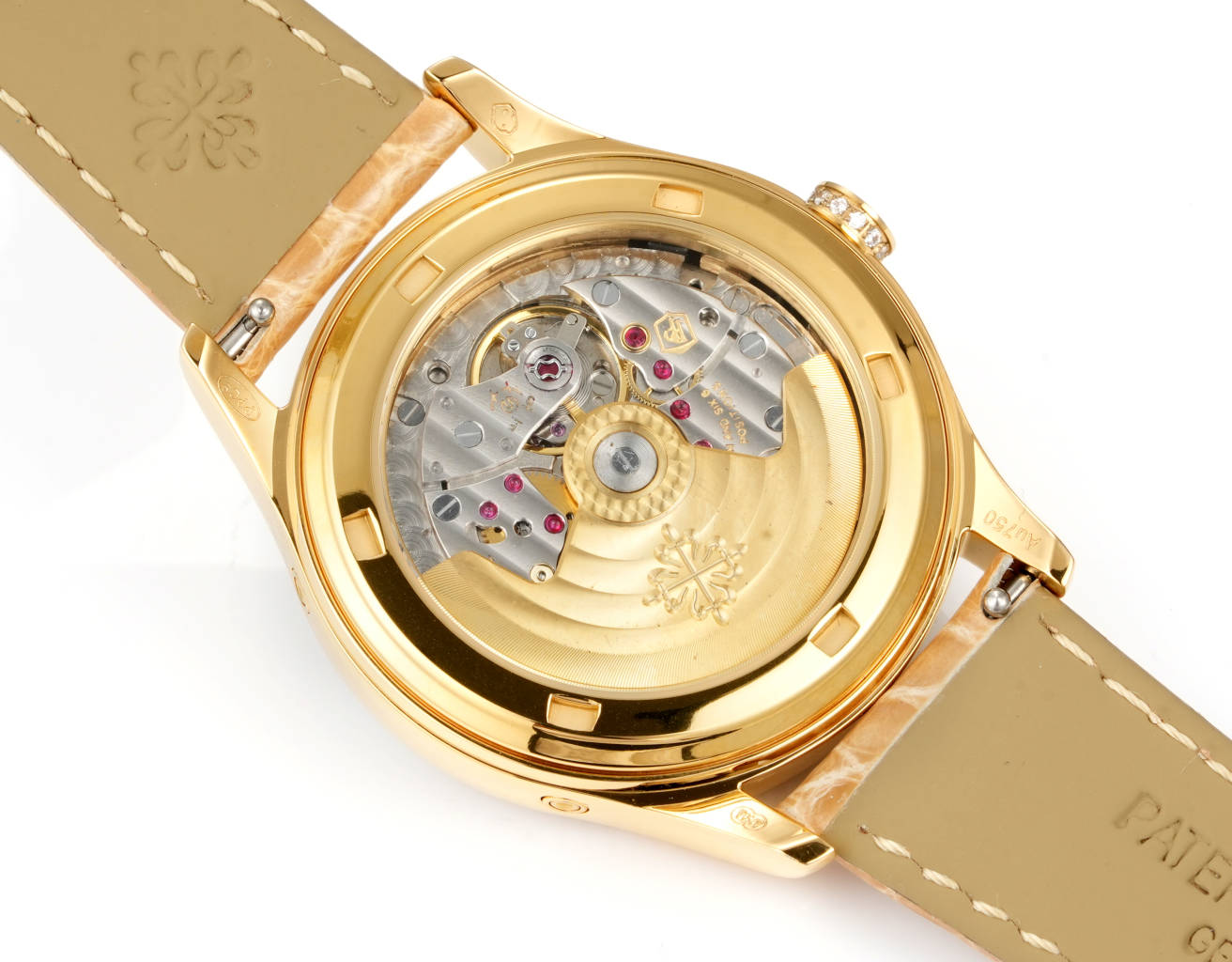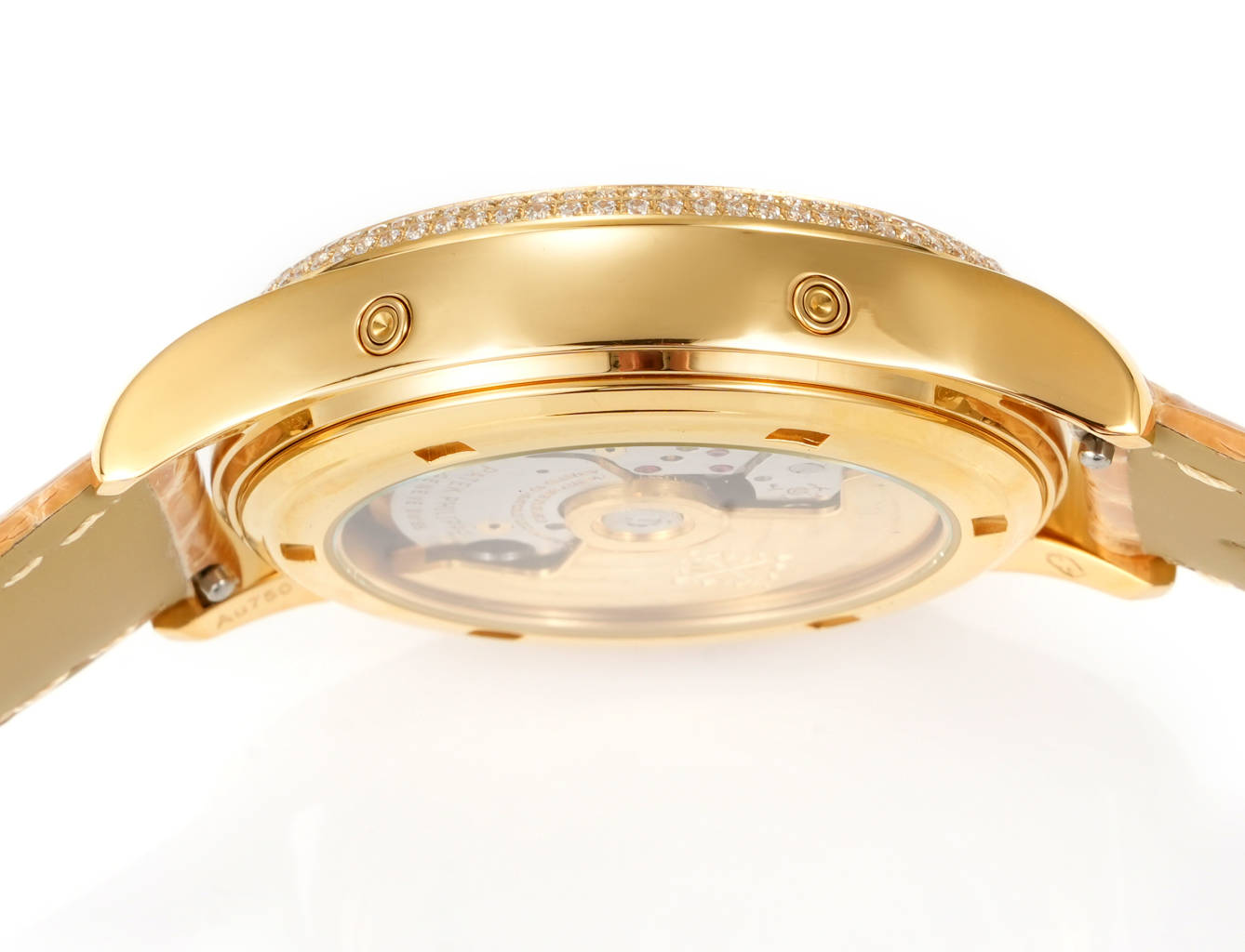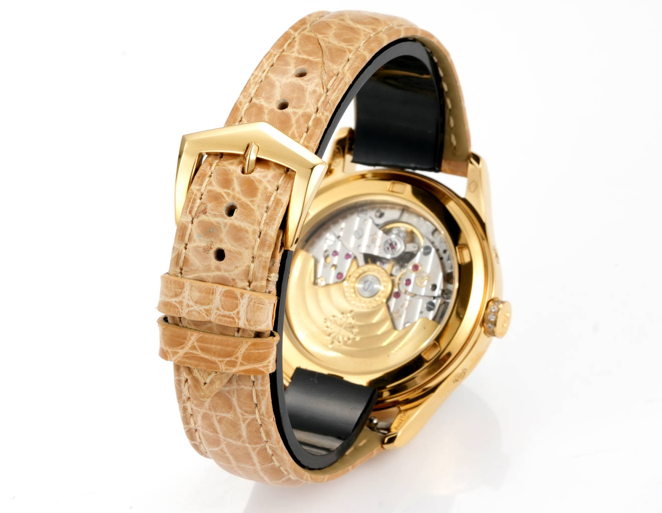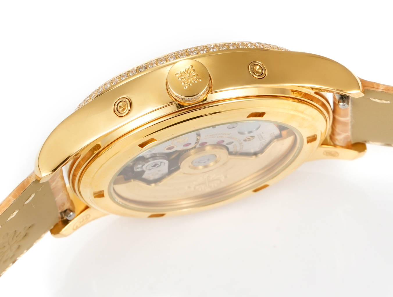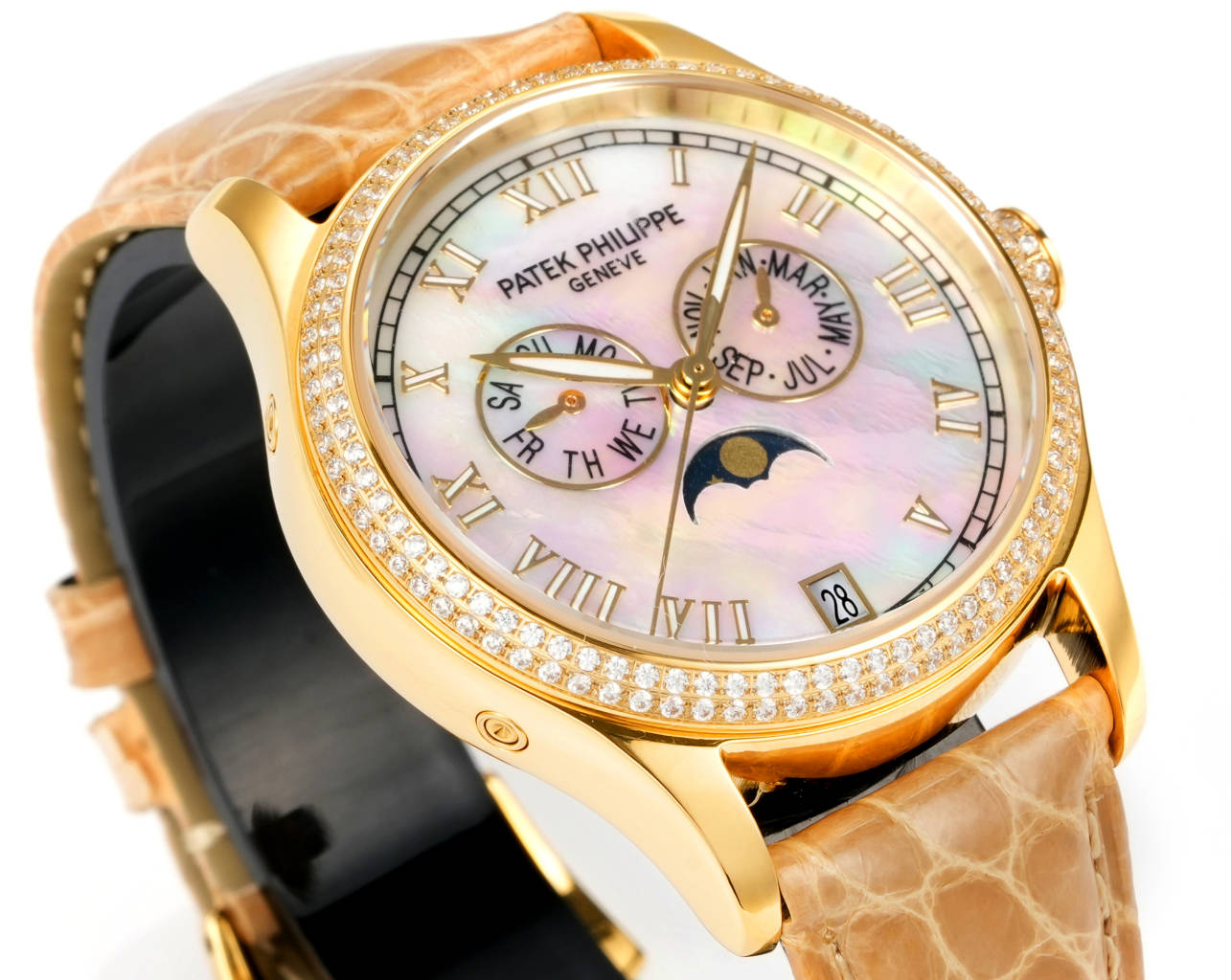 | Patek Philippe Complications 37mm White Pearl Dial Yellow Gold Diamond Bezel Yellow Leather Strap 4936J-001 Woman Ladies | |