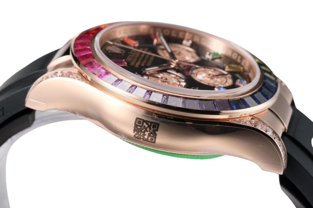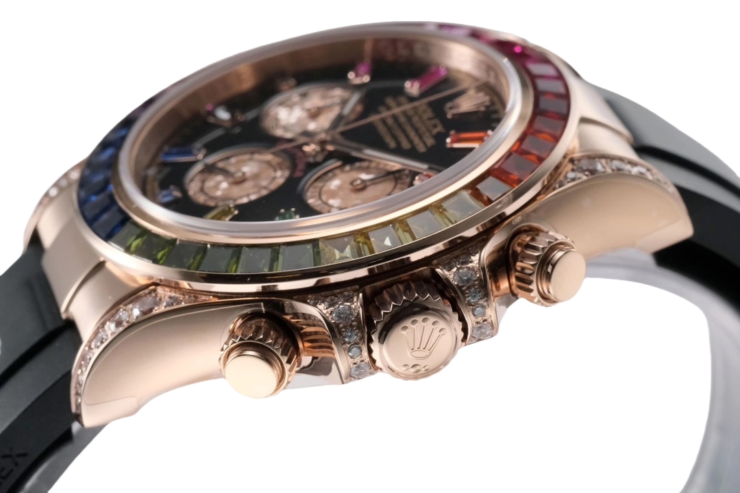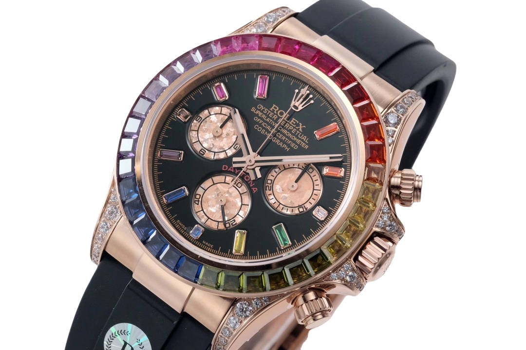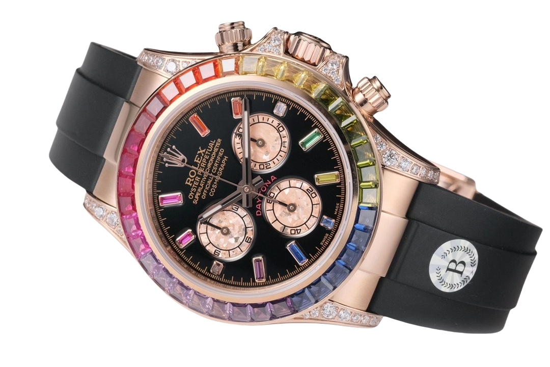 | Rolex Daytona Rainbow 40mm Black Dial Rose Gold Diamond Bezel Black Rubber Strap 116595 RBOW | |