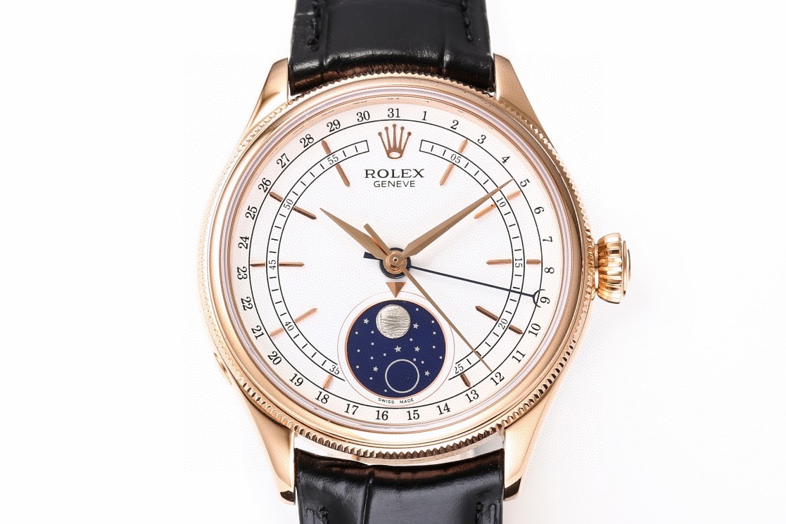 Rolex Cellini Moonphase 39mm White Dial Rose Gold Bezel Black Leather 50535-0002