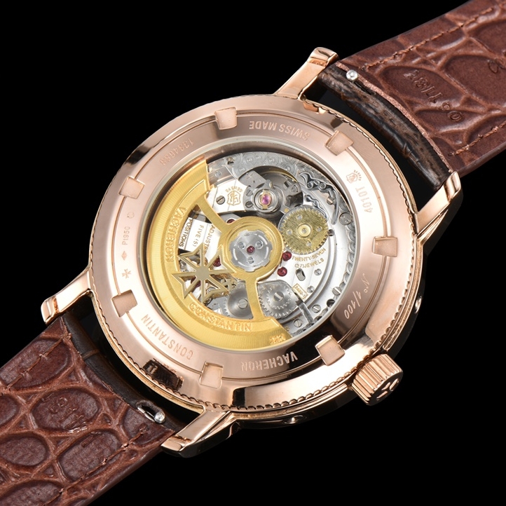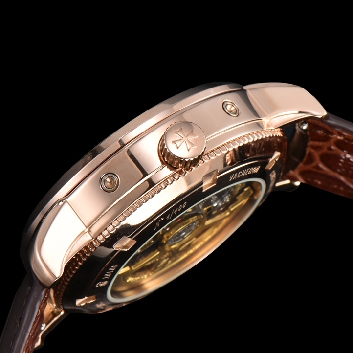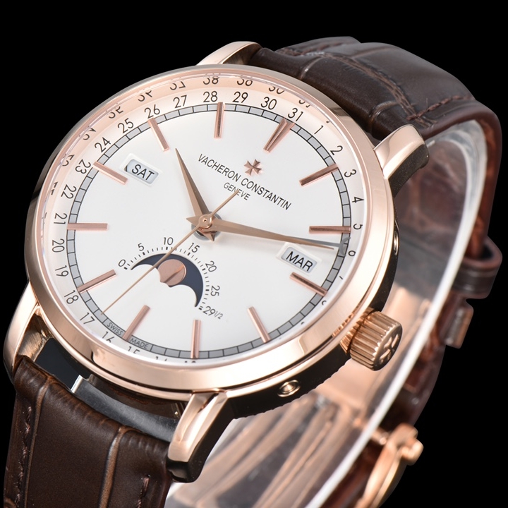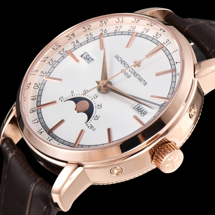[Dial]: The track-type minute scale and the toffee-style hour and minute hands retain the iconic calendar display created by Vacheron Constantin. The day and month windows are symmetrically distributed on both sides of the dial, and the digital bezel on the outer edge of the dial is a calendar display. It is gently lifted by an elegant black crescent hand for easy reading. The ingenious design breaks the dullness of the dial. This layout clearly shows the precise moon phase display at 6 o'clock. While showing the smart charm, it also shows the unique beauty of complex machinery.
