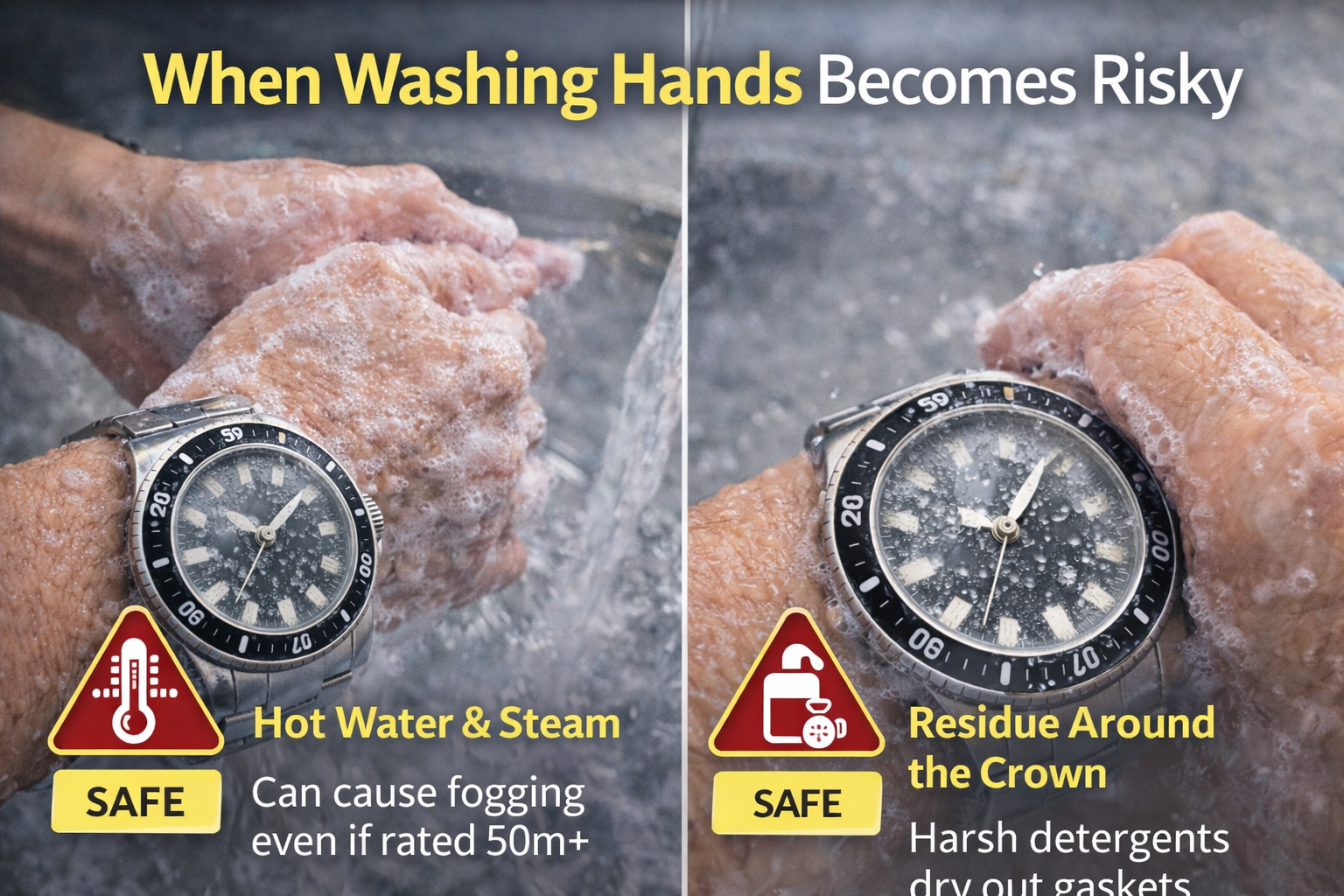 Yes, hand washing with a watch on is usually safe for many watches—as long as you keep the crown sealed, avoid hot water/steam, and rinse off soap residue. The biggest risks are a loose crown, repeated hot water exposure, and soap pushing past aging gaskets. If you see fogging afterward, moisture may already be inside.