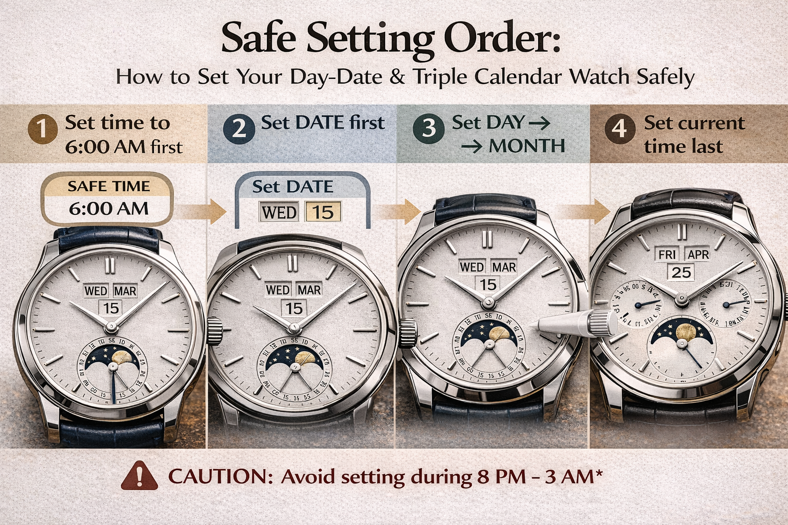 Day-Date & Triple Calendar Setting Guide: Safe Order, Danger Zone & Common Mistakes