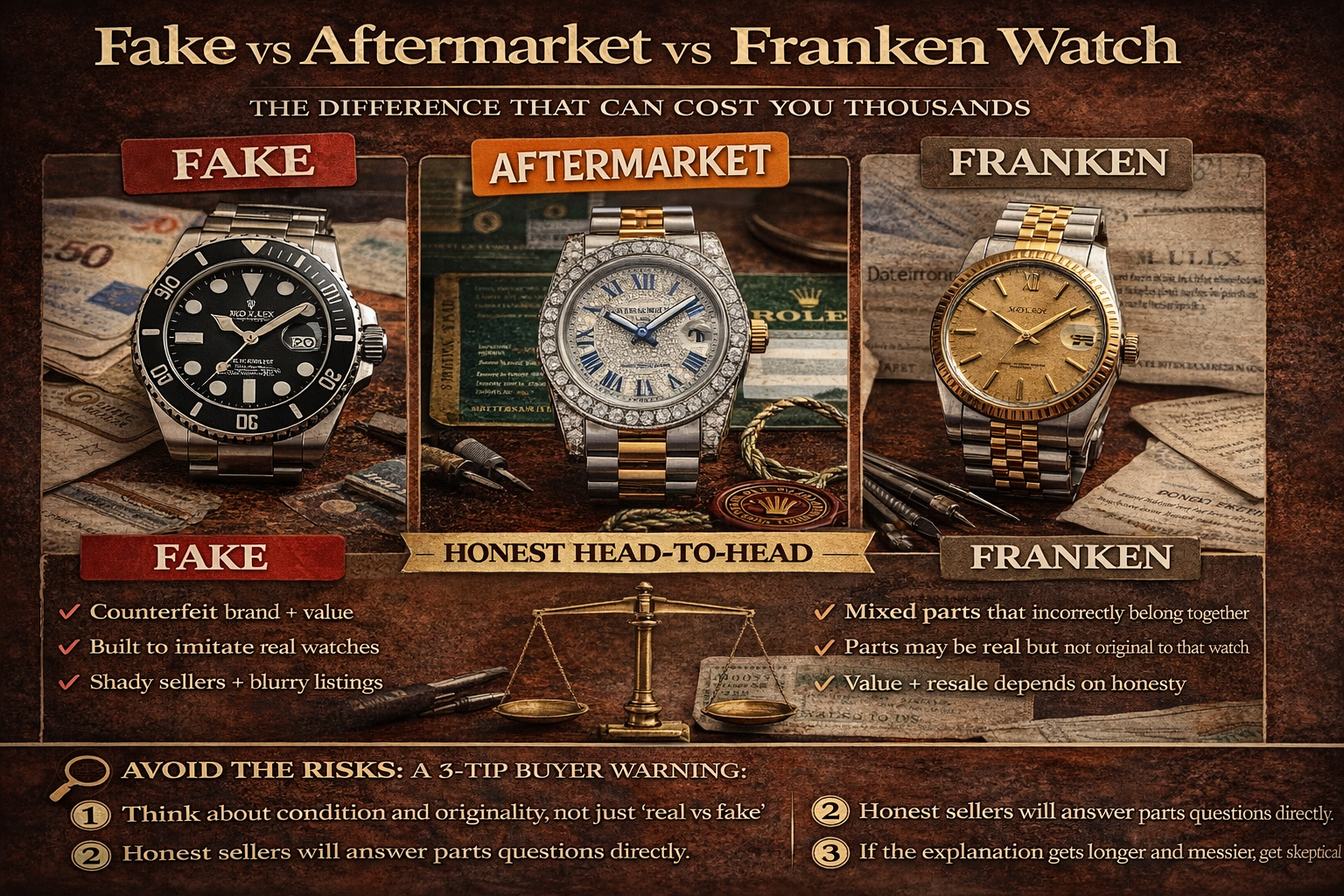 A fake watch, an aftermarket watch, and a franken watch can all disappoint you—but they do not damage value, trust, and resale in the same way.