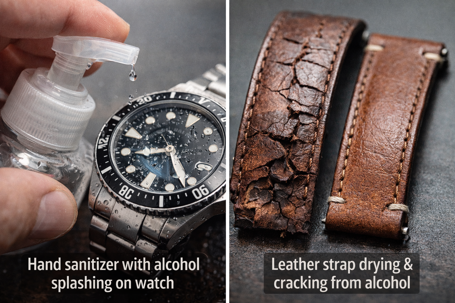 A single accidental splash is usually not catastrophic, but repeated exposure (daily use) can dry materials out, weaken seals, and cause discoloration. If sanitizer gets on your watch, wipe it off immediately and clean the exterior properly.