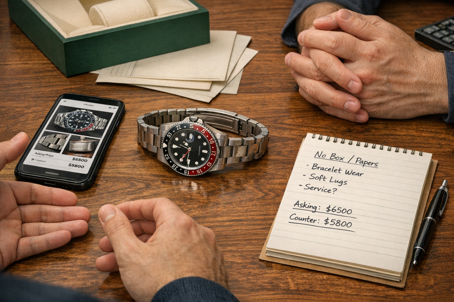 A lot of buyers get this wrong in one of two ways. Some are too timid and pay full ask even when the watch clearly has condition or service risk that justifies a lower number. Others go too hard, too early, and turn a workable deal into an awkward dead end.
