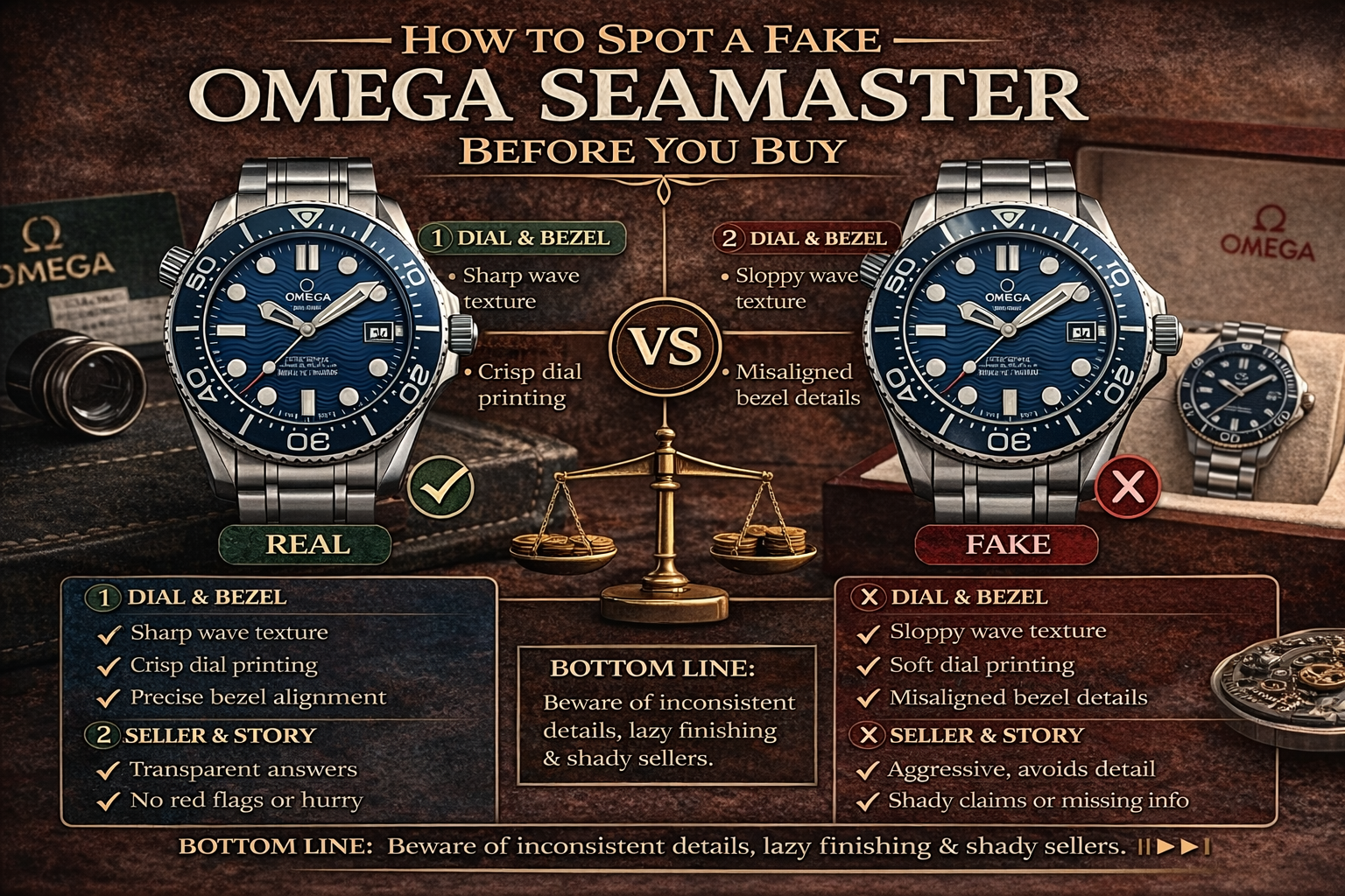 The safest way to spot a fake Omega Seamaster is not to hunt for one magic flaw. It’s to check the watch, the seller, the parts, and the story together.