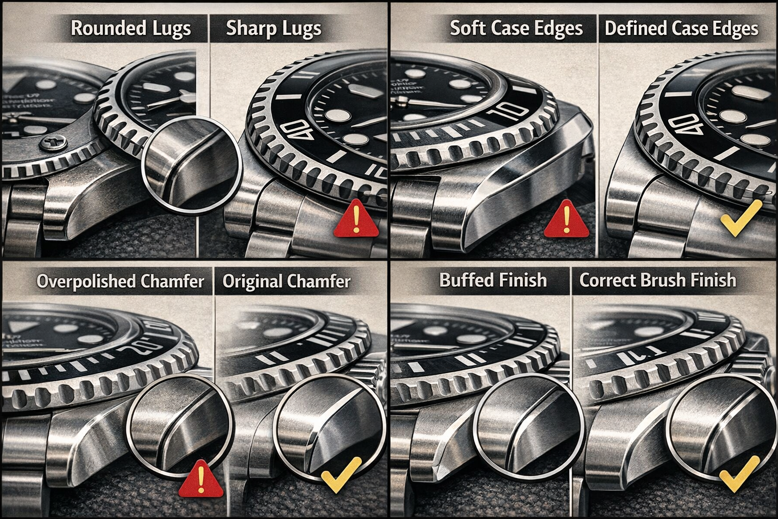 That matters even more on watches with strong case architecture. A soft dress watch may hide bad refinishing better. A sharp sports watch usually does not.