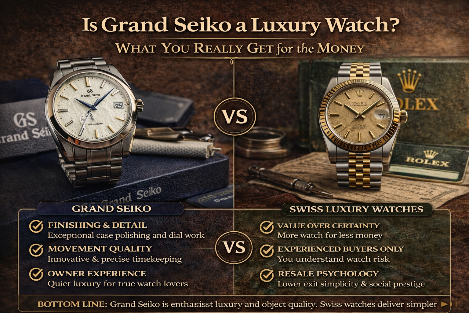 He ends up buying Grand Seiko because he realizes he wants the watch that feels richer in private, not louder in public.