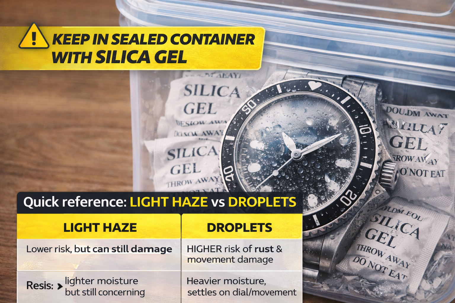 Fogging is condensation: warm air inside the watch meets a cooler crystal and water vapor turns into droplets. This is not a cosmetic issue—moisture can damage the dial, hands, and movement oils, and start corrosion.