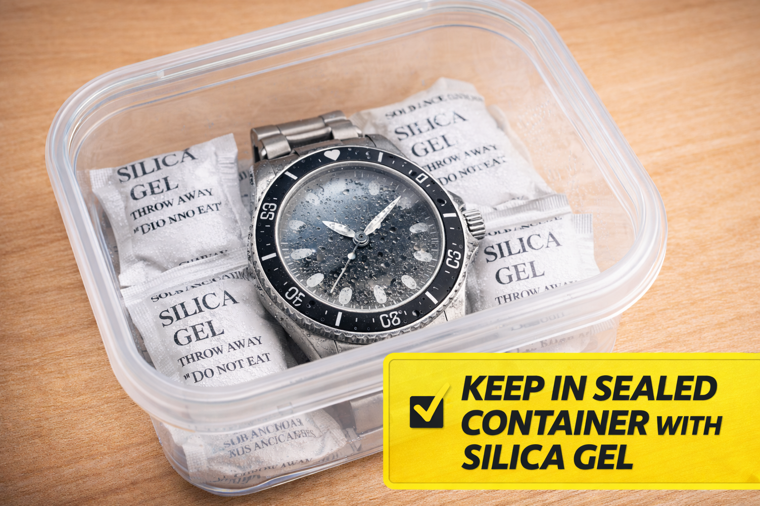 If you have silica gel packs: place the watch in a sealed container with multiple packs.