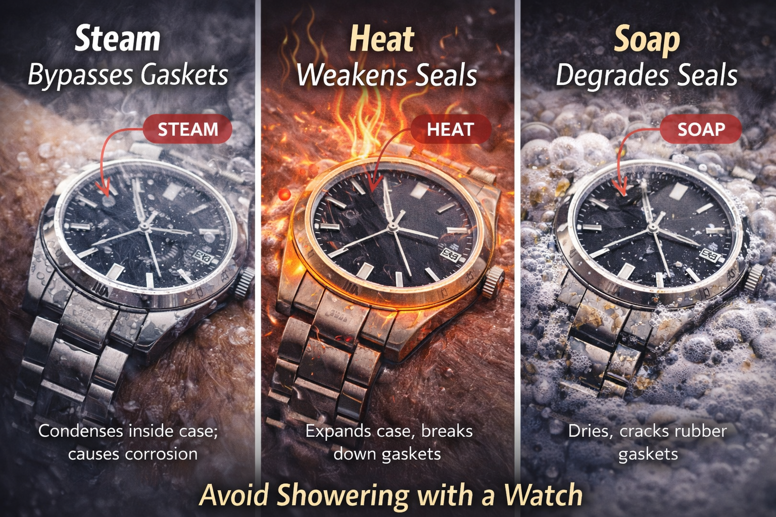 This is why fogging often appears after a shower, not during — something proper daily watch care habits are designed to prevent.