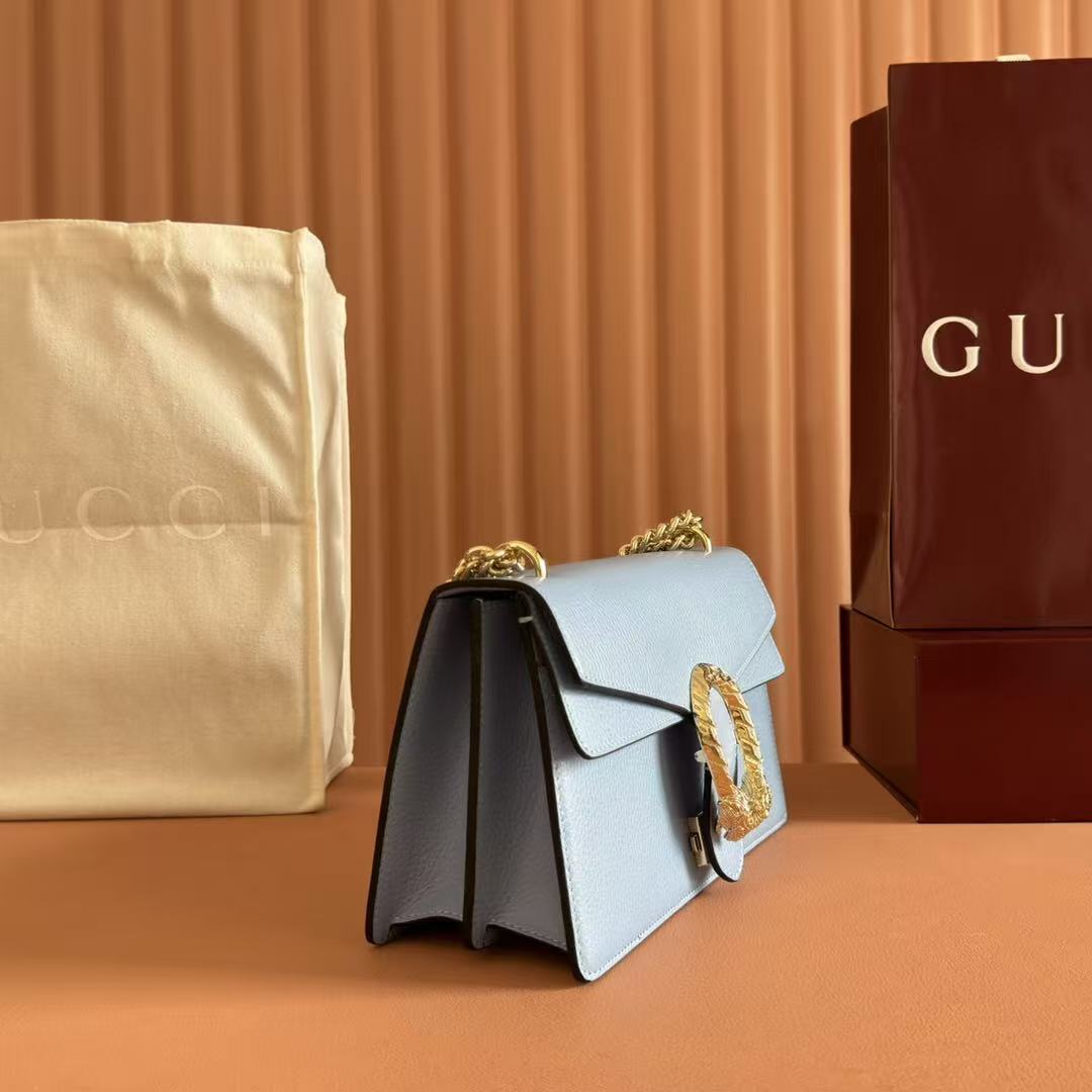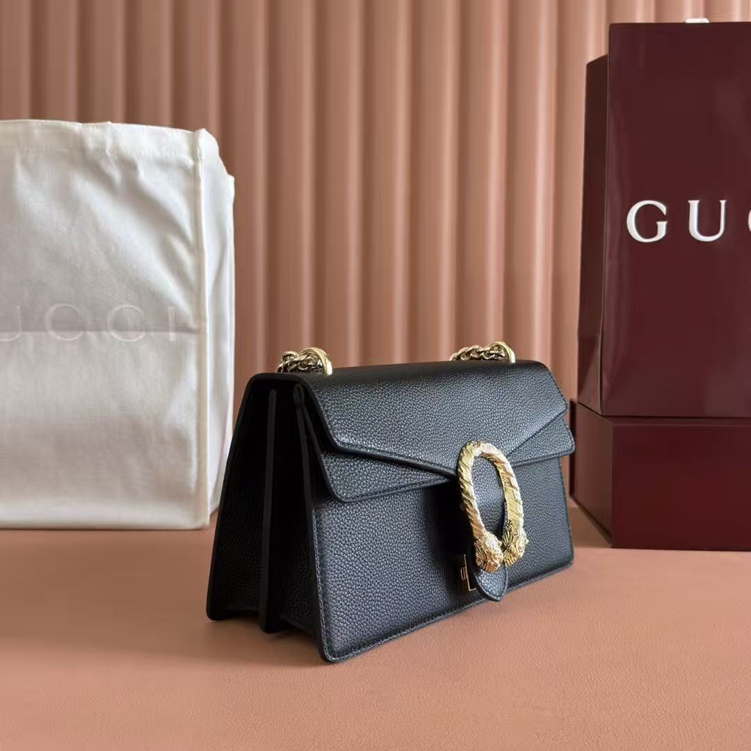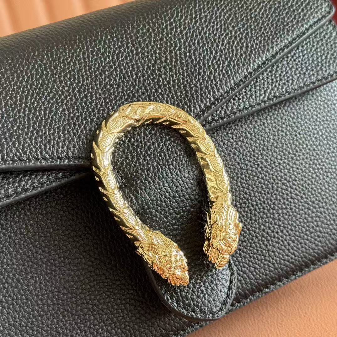 This new addition to the Dionysus collection is expertly crafted from black cowhide leather. It features a double tiger head lock with a flap and an adjustable sliding chain for versatile styling.