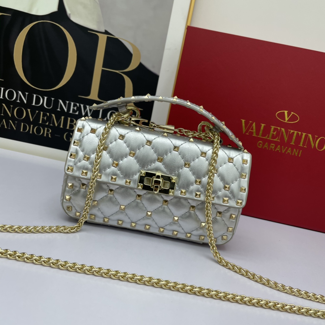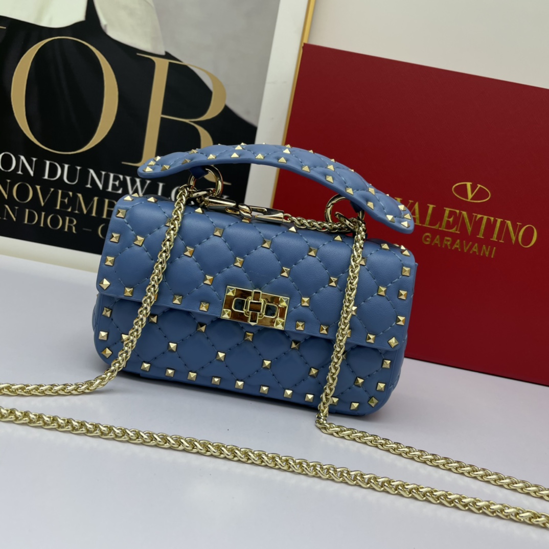The Rockstud Spike small chain handbag is crafted from supple metallic Nappa lambskin. It features quilted stitching and small studs. It comes with a detachable handle and a detachable sliding chain, allowing it to be carried on the shoulder, crossbody, or by hand. 0120 Dimensions: 20*12*5cm
